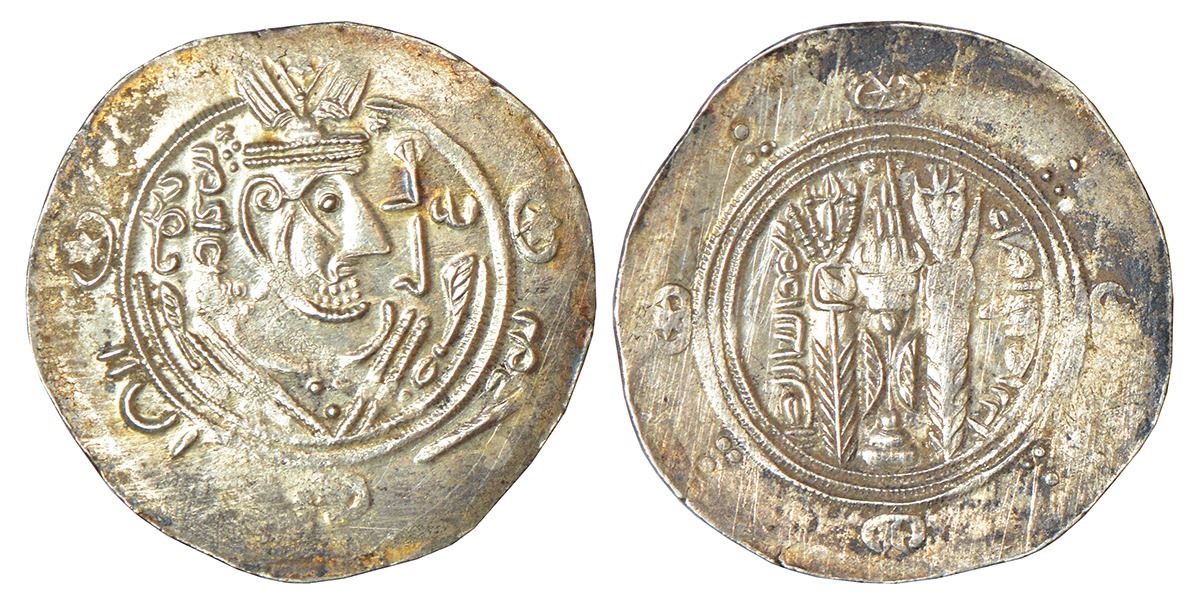 Abbasid Caliphate, temp. Al-Rashid (AH 170-193/AD 786-809), silver hemidrachm of Arab governors of Tabaristan, citing Hani (AH 172-174/AD 788-790), PYE 137 = AH 172 = AD 788, Album 69, 1.96g. Obv: crowned and draped Sasanian-style bust to right; behind head, AFZUT GDH ('may his kingship increase' in Pahlavi); before head, 'Hani' in Kufic; in outer margin, APD/NWKW ('excellent' and 'good' in Pahlavi). Rev: Sasanian fire altar set on three steps, flanked by two attendants standing facing; to left, date; to right, mint TPURSTAN ('Tabaristan' in Pahlavi).