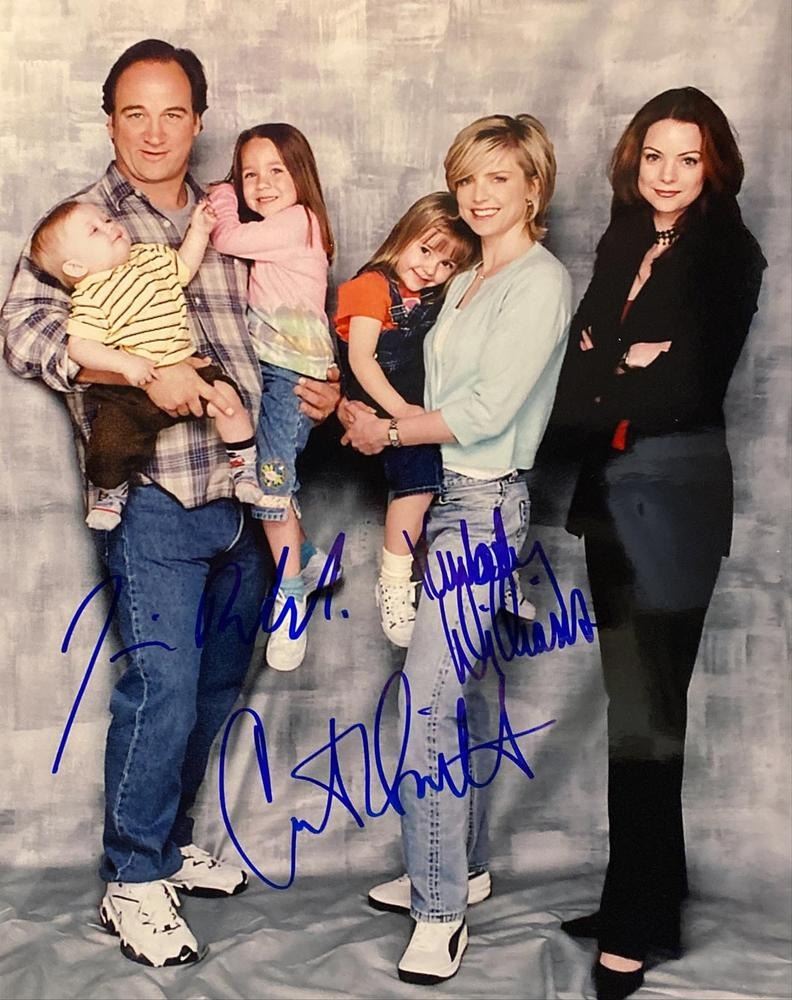 According to Jim cast signed photo autographed by Jim Belushi, Courtney Thorne-Smith, and Kimberly Williams-Paisley. 8x10 inches
