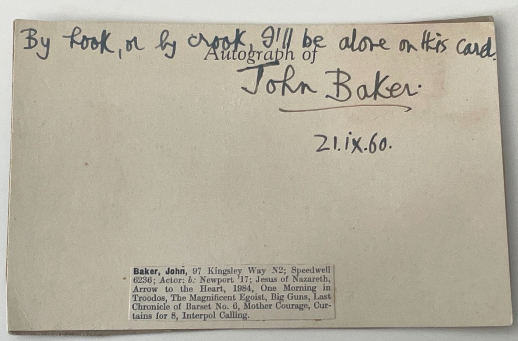 Actor John Baker autograph note. 3x5 inches