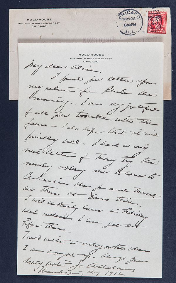 Addams, Jane (1860-1935) Social reformer, pacifist, and feminist; the first American woman to win the Nobel Peace Prize (1931). She also established Hull-House, which provided services for the immigrant and poor population of Chicago. It was the city's first settlement house and one of the earliest ones created in the United States. Autograph letter signed ("J Addams") on Hull-House letterhead, Chicago, November 1912. To Mrs. Alice Haldeman in Girard, Kansas, thanking her for her trouble and discussing a possible visit. With holograph envelope from Hull-House.
