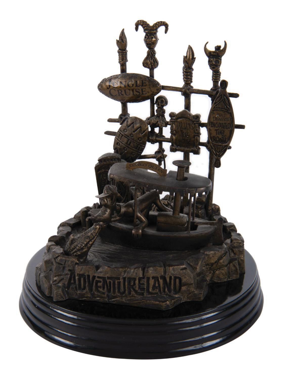(Disneyland, 2005) A commemorative Adventureland sculpture created by Larry Nikolai in honor of Disneyland's 50th anniversary. The spirit of Adventureland is celebrated as the intrepid explorer Pluto boards the Congo Queen. Measuring 8" tall atop a 7" diameter polished base, the sculpture displays in fine condition.
