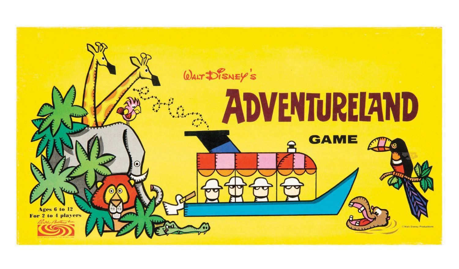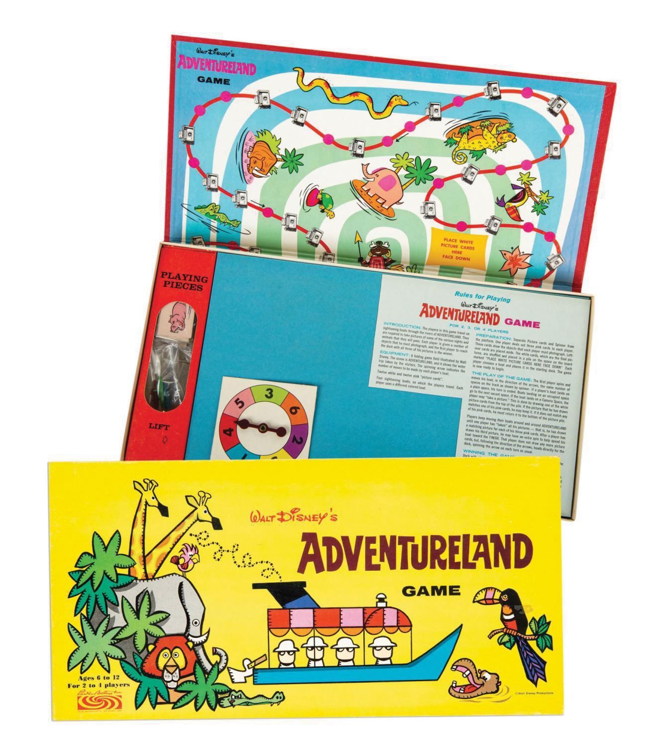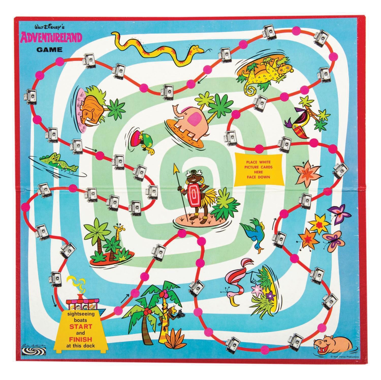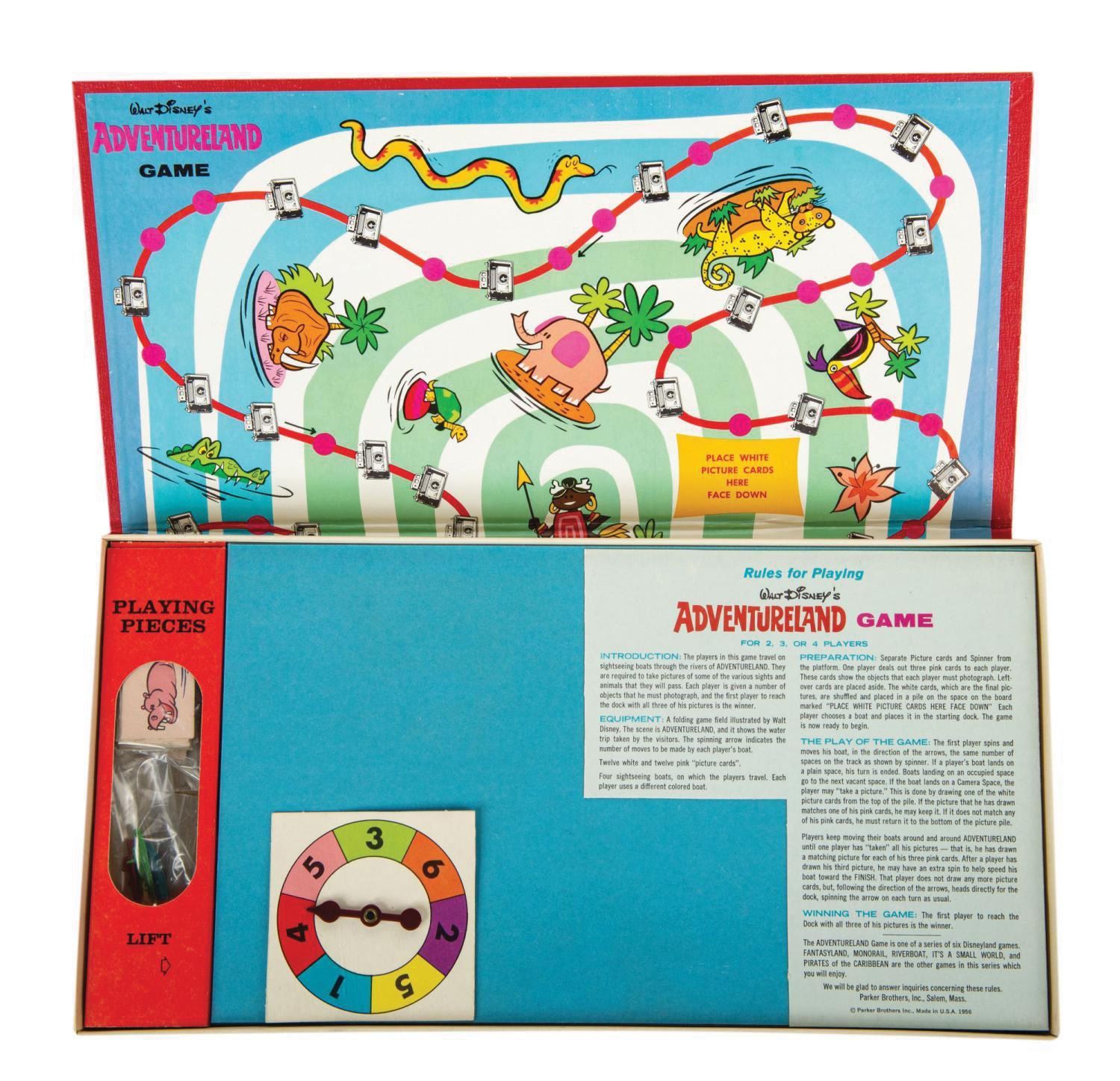 (Disneyland, 1956) A vintage Adventureland Game by Parker Brothers. The game sets players on route through the rivers of Adventureland, and this complete game includes the game board, instruction card with spinning arrow, (4) metal "sightseeing boat" tokens, and (24) pink and white picture cards. Measuring 16.5"x8.5" by 1.25" deep, the box and original divider with plastic window, and contents are in fine condition, with spinner detached from instruction card, and very slight fading and minor spots of discoloration to box corners.
