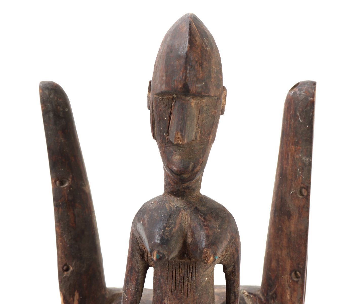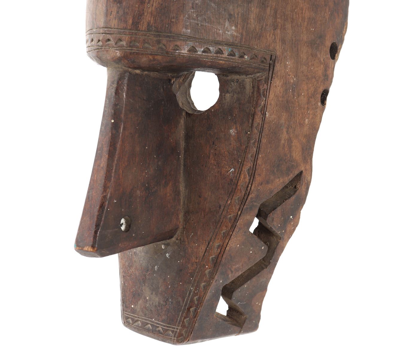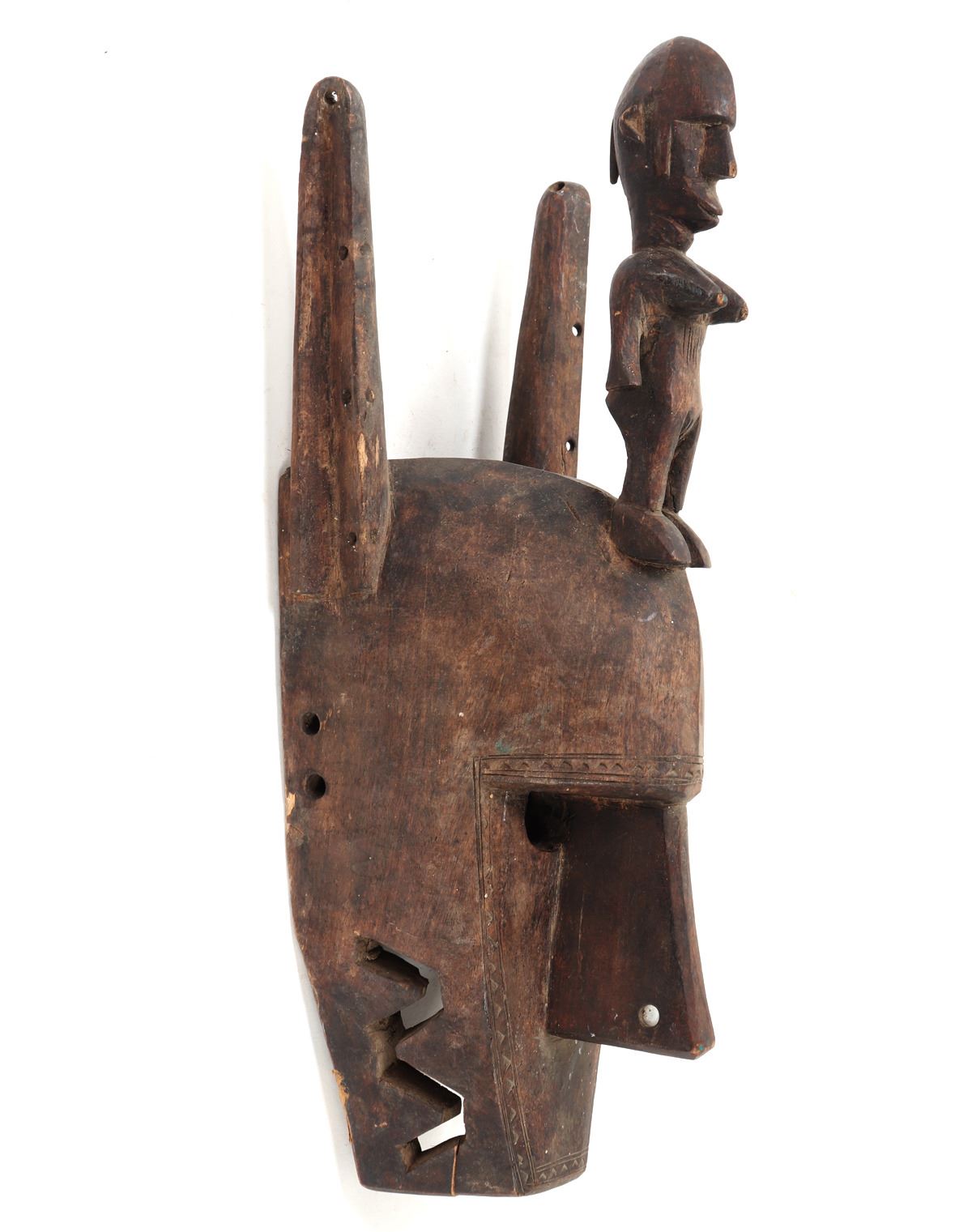 African Bamana (Bambara) wooden mask with carved standing female figure to forehead. Incised zigzag designs around the face, openwork carved zigzag sections to both sides of the jaw. Originating from the Bamana people of Mali, the mask embodies traditional craftsmanship and symbolic significance, often used in ceremonial rituals. The female figure represents fertility and protection. Size 17 1/4" L, Weight 1 lb 13.4 oz. Provenance: Collected prior to 2008, ex-Lacy Gallery (Vanna & Lee Lacy collection), Los Angeles CA. Lacy Gallery was founded upon six decades of collecting ethnographic and fine art. Lee Lacy was a distinguished Hollywood producer of iconic TV series and commercials.