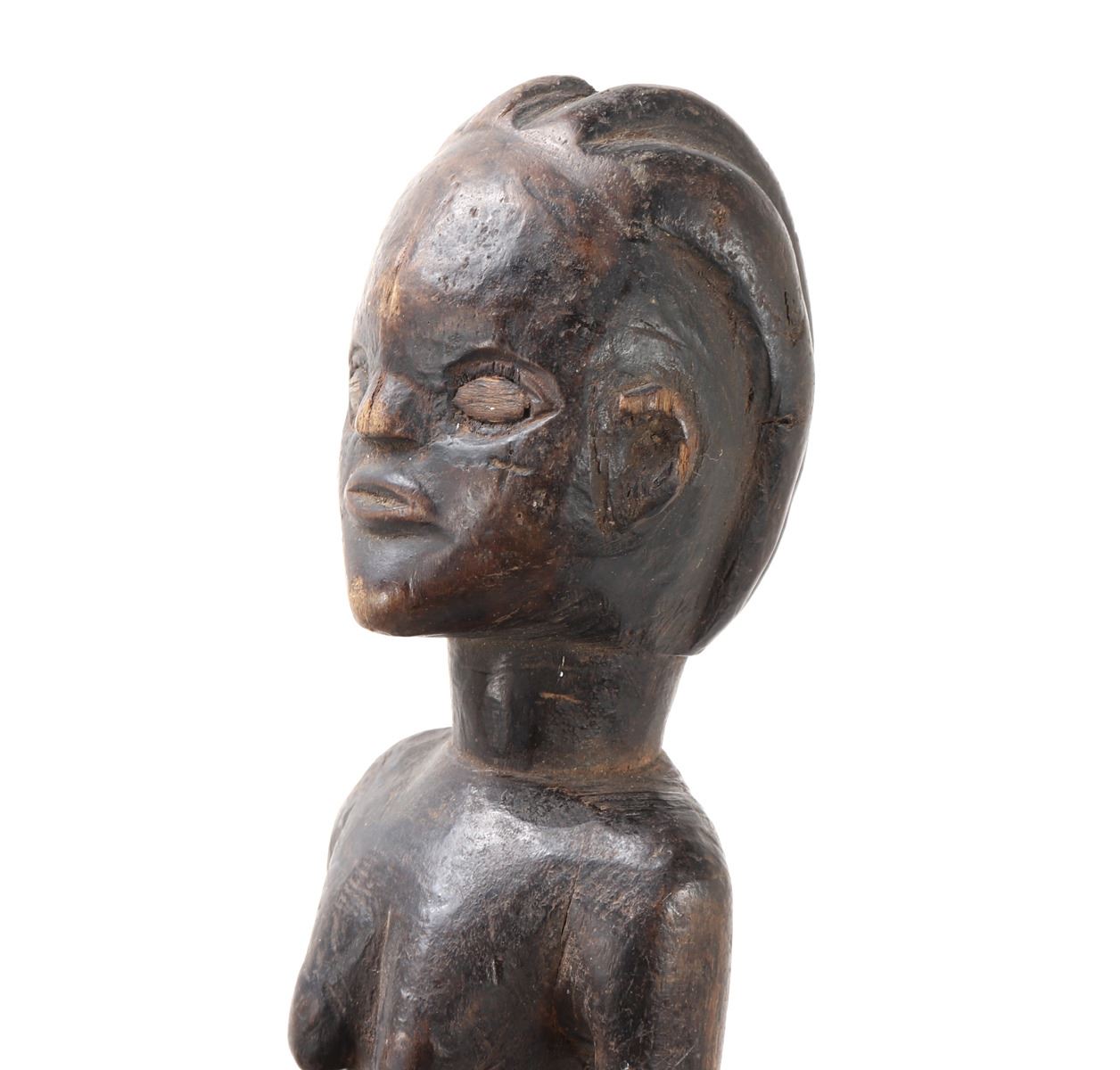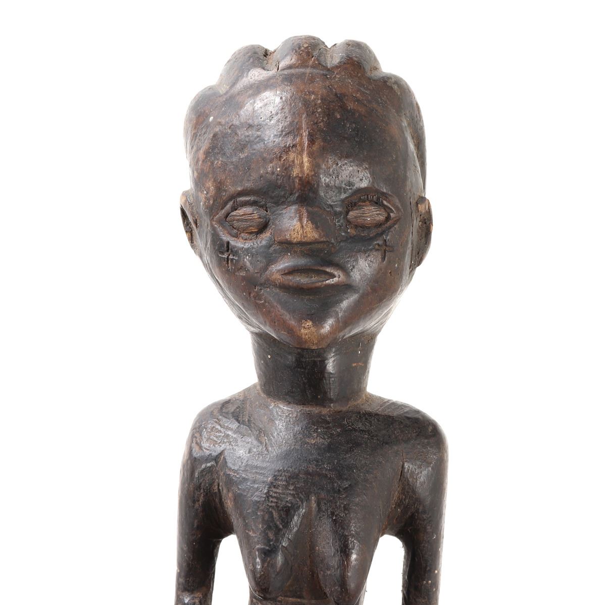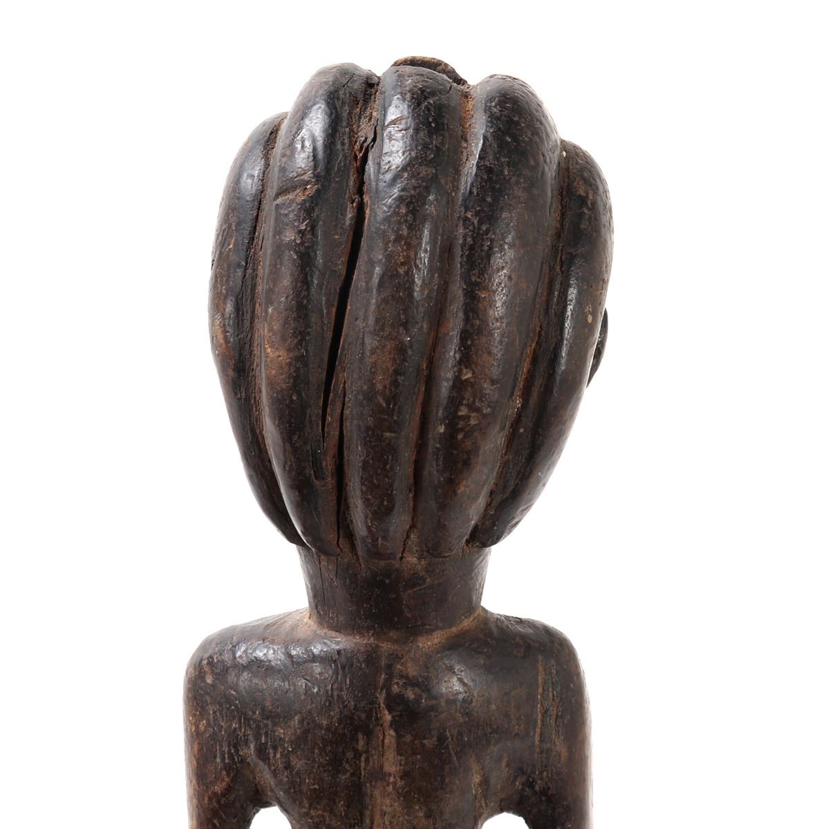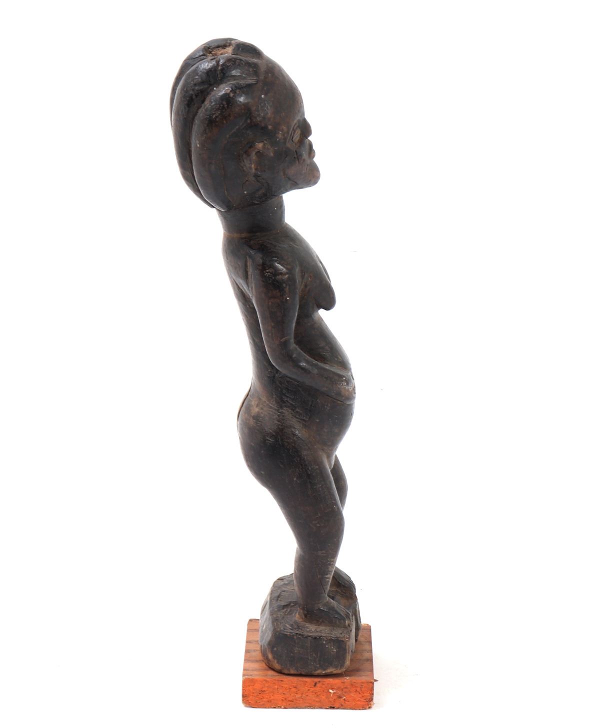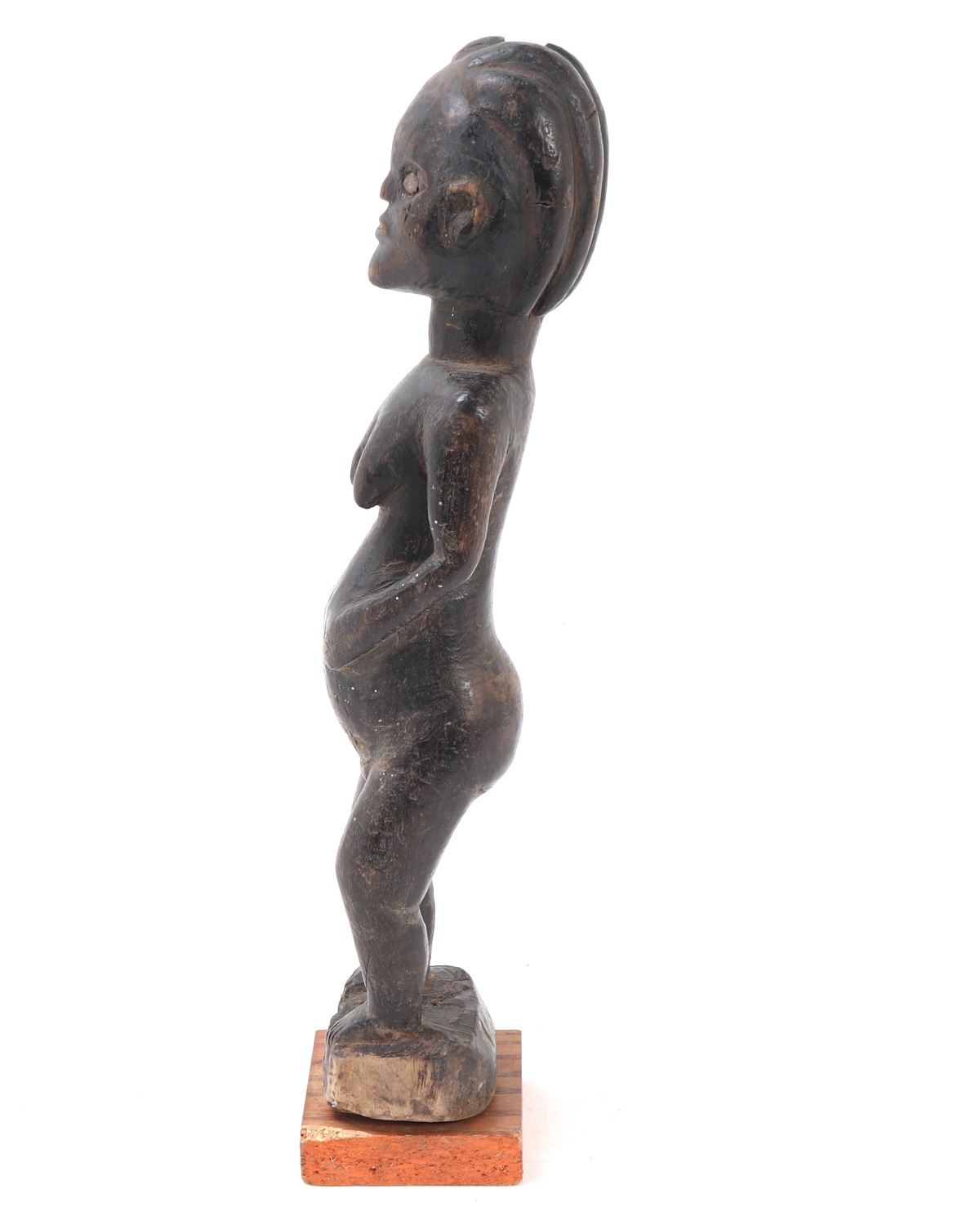 Africa, Ivory Coast. Carved wooden figure from the Baule people of the Ivory Coast. Carved from a hardwood, the dark wood exhibits lighten shades from wear and age creating an attractive patina. Two carved crosses below the figures eyes. Size 12 3/4" L, Weight 343 g. Condition: Loss and crack to figures foot base as well as to section of the head.. Provenance: Collected prior to 2008, ex-Lacy Gallery (Vanna & Lee Lacy collection), Los Angeles CA. Lacy Gallery was founded upon six decades of collecting ethnographic and fine art. Lee Lacy was a distinguished Hollywood producer of iconic TV series and commercials.