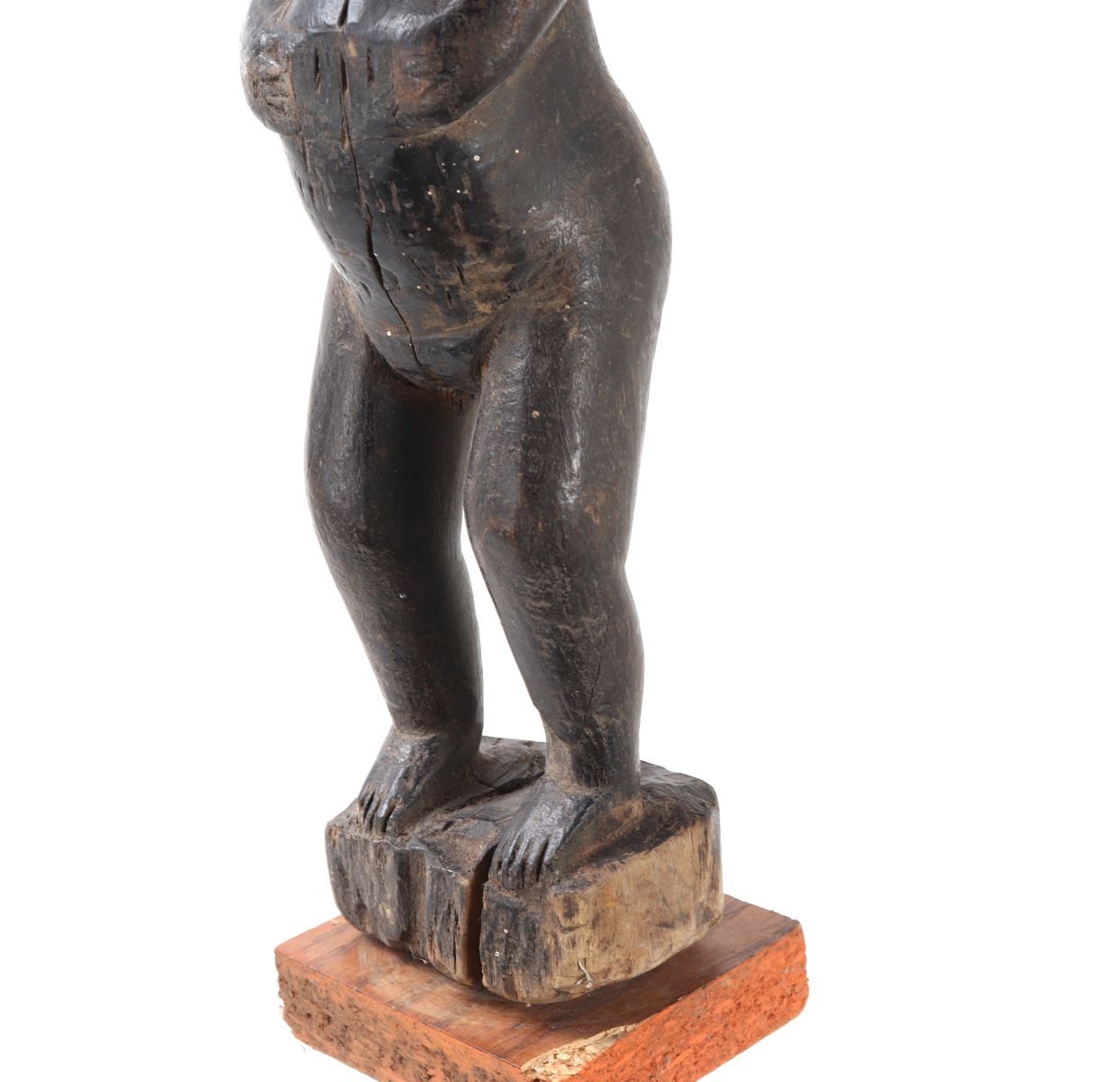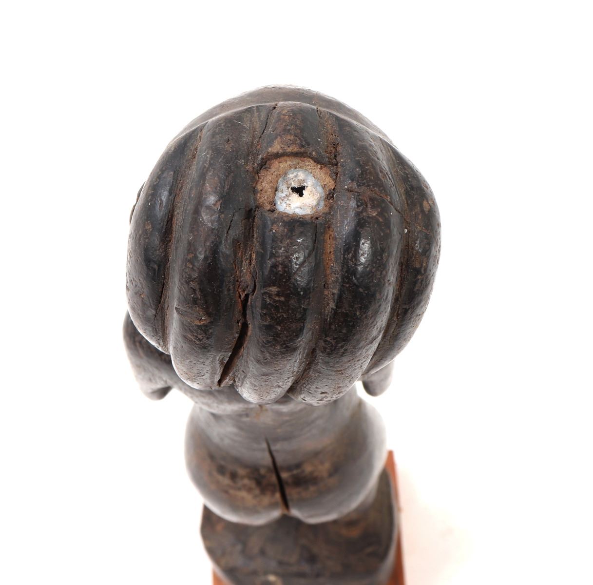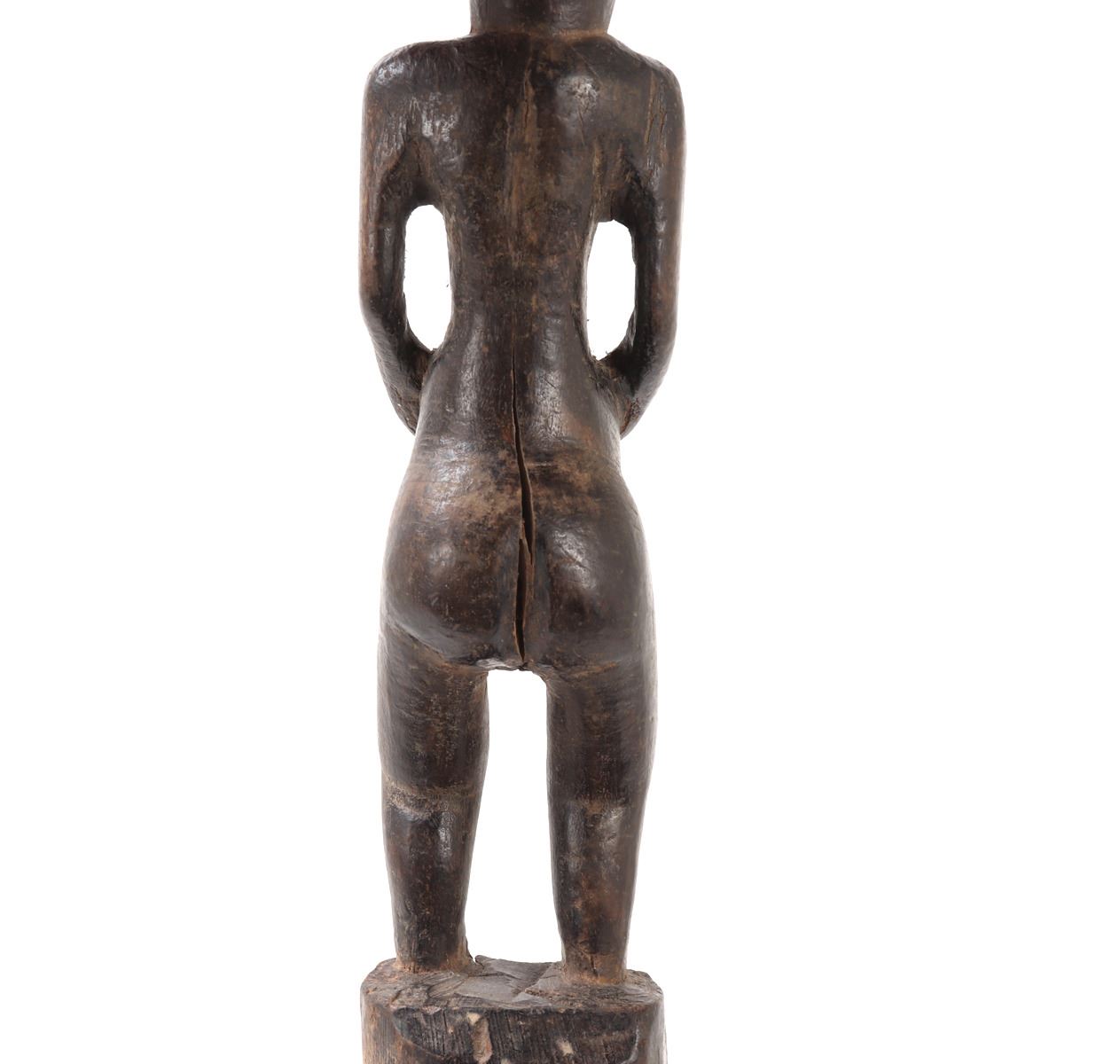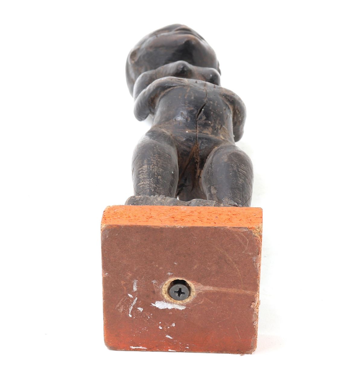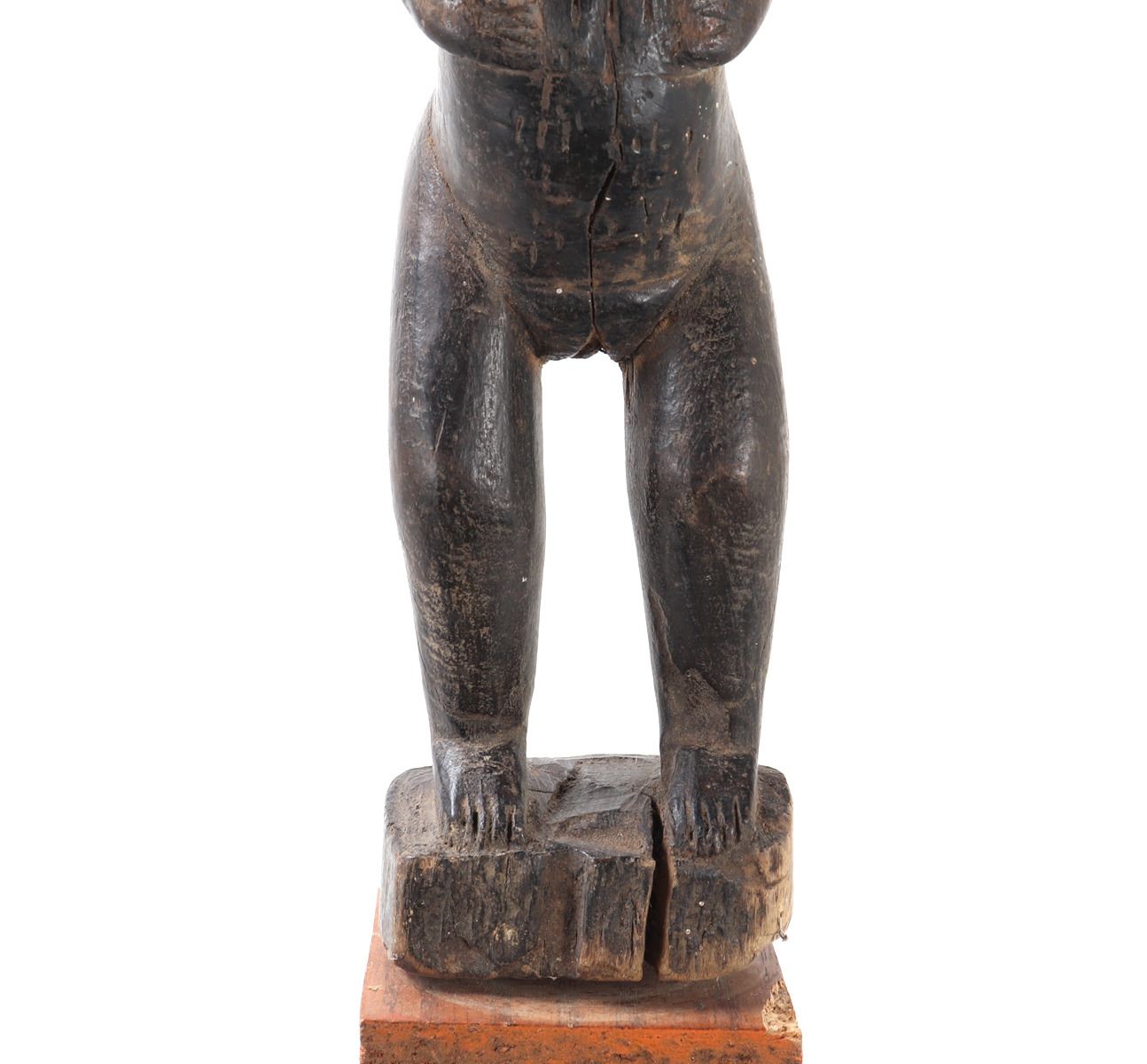 Africa, Ivory Coast. Carved wooden figure from the Baule people of the Ivory Coast. Carved from a hardwood, the dark wood exhibits lighten shades from wear and age creating an attractive patina. Two carved crosses below the figures eyes. Size 12 3/4" L, Weight 343 g. Condition: Loss and crack to figures foot base as well as to section of the head.. Provenance: Collected prior to 2008, ex-Lacy Gallery (Vanna & Lee Lacy collection), Los Angeles CA. Lacy Gallery was founded upon six decades of collecting ethnographic and fine art. Lee Lacy was a distinguished Hollywood producer of iconic TV series and commercials.