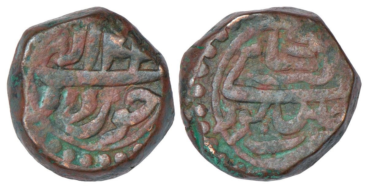 Akbar (1556-1605 AD), copper ½ dam, Chainpur mint, Khurdad 4x, KM 23.16, 10.14g.