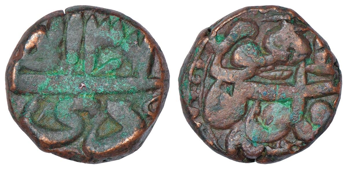 Akbar (1556-1605 AD), copper ½ dam, Lahore mint, KM 23.5, 10.27g. Obv: Ilahi 36 month Di. Rev: Falus-i-Lahore.