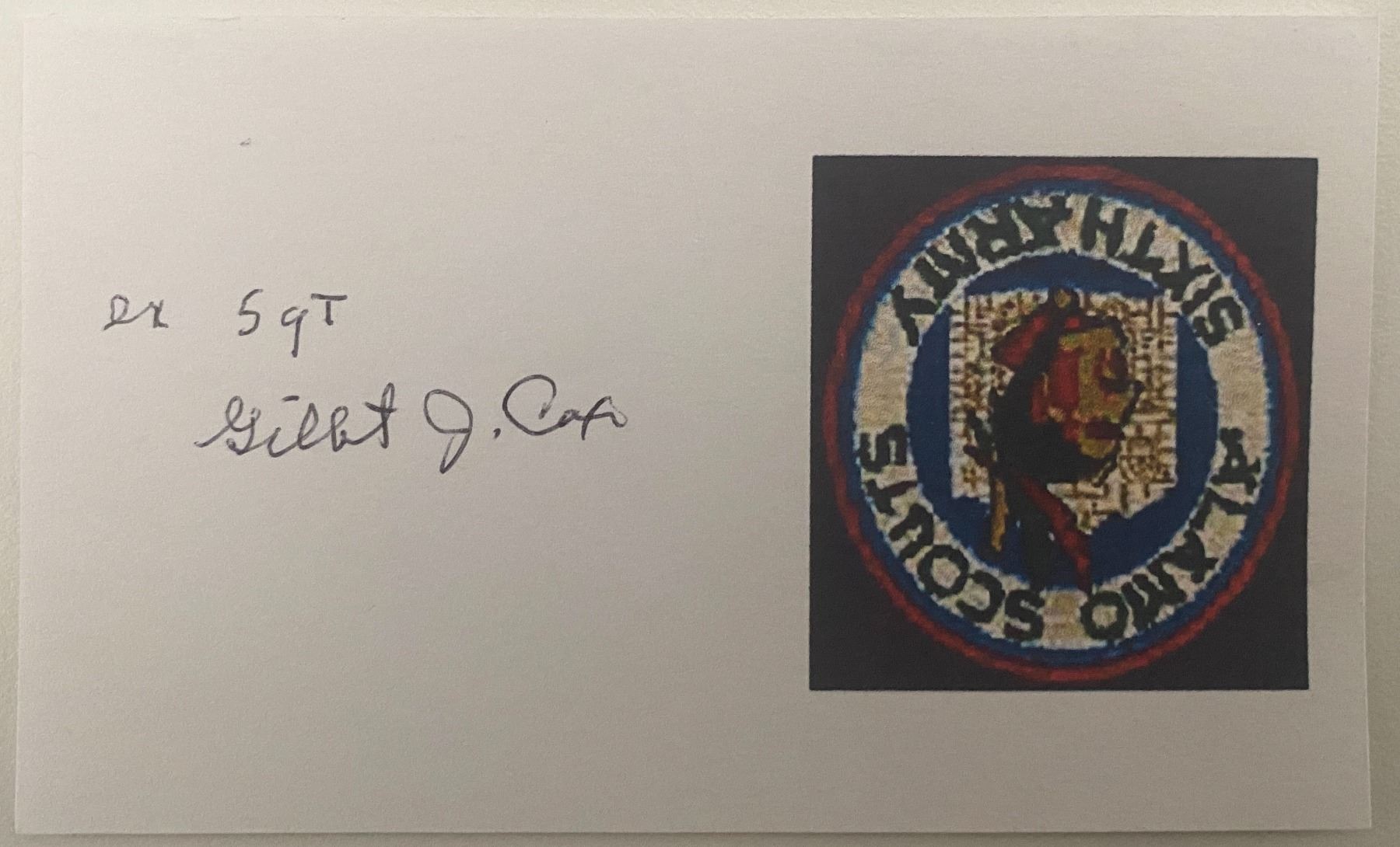 Alamo Scout Gilbert Cox signed note. 3x5inches