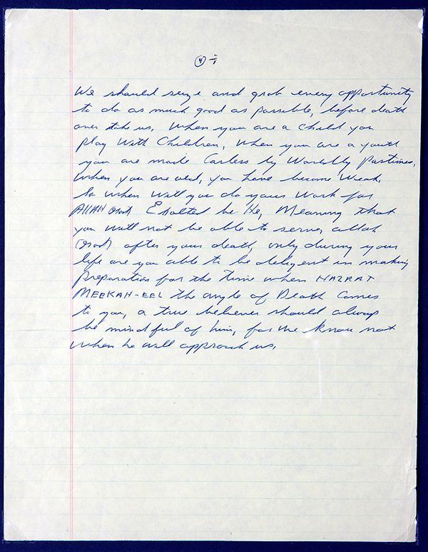 Ali, Muhammad (1942 -) Handwritten, unsigned statement by Ali on his Islamic faith. Quoted as written: "We should seize and grab every opportunity to do as much good as possible, before death over take us. When you are a child you play with children, when you are a youth you are made carless by worldly pastimes, when you are old, you have become weak, so when will you do your work for ALLAH (God) Exalted be He, meaning that you will not be able to serve, allah (God) after your death, only during your life are you able to be deligent in making preparation for the time when HAZRAT MEEKAH-EEL the angle of Death comes to you, a true believes should always be mindful of him, for we know not when he will approach us." Page 4 of a manuscript. Matted with an image of Ali in boxing stance, and a plaque and framed to an overall size of 22� x 18� in. This manuscript was obtained from Ali's ex-wife, Veronica Porsche Ali, in the 1980s.