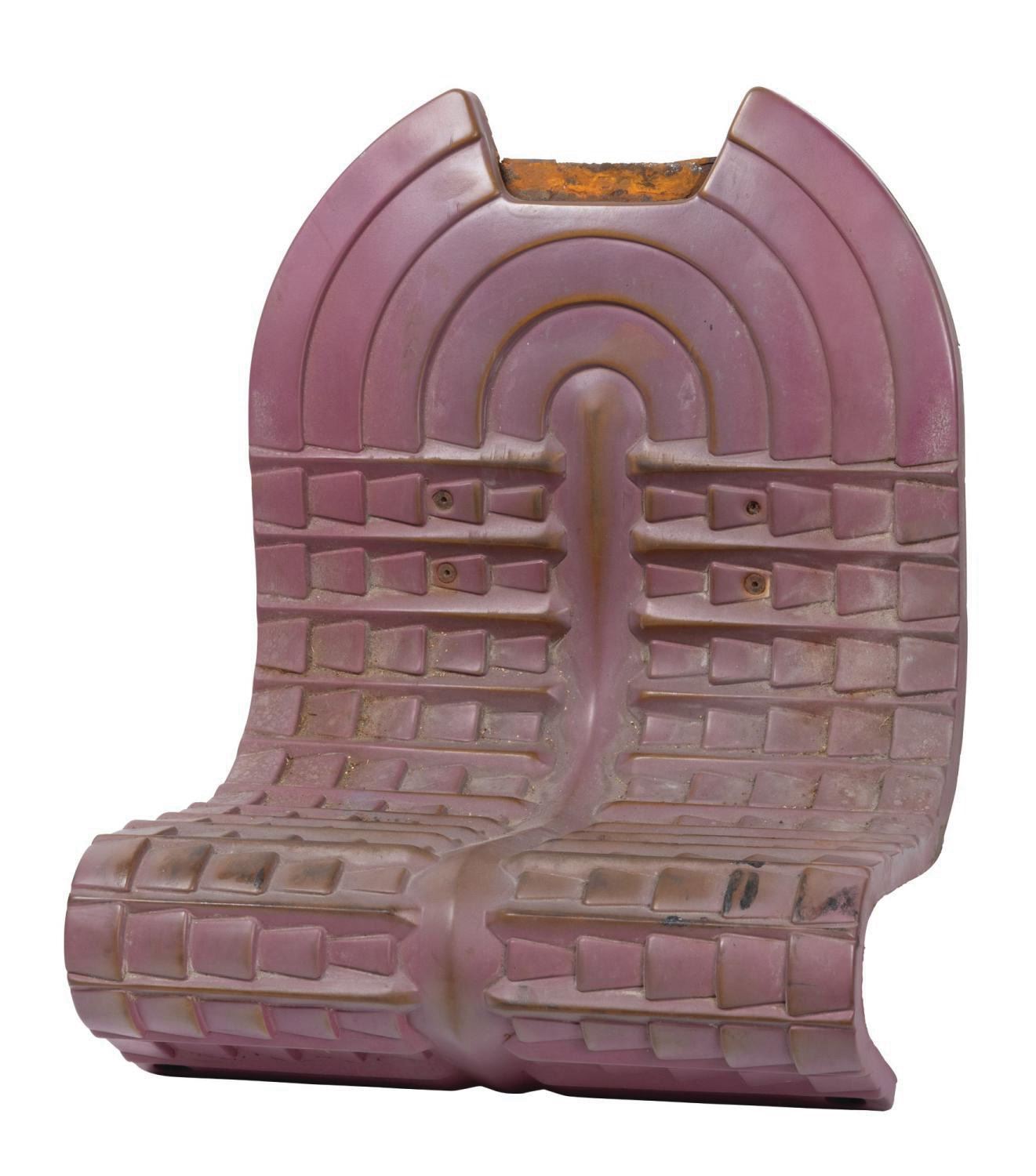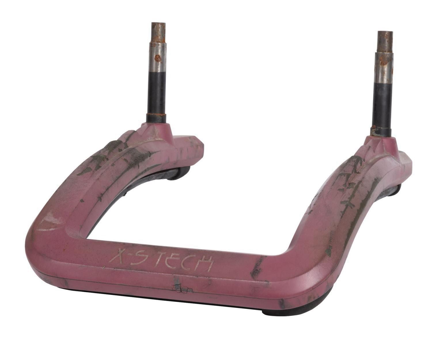 (Walt Disney World, 1995-2003) A seat and restraint component from the ExtraTERRORestrial Alien Encounter attraction from the Magic Kingdom at Walt Disney World Resort. This was one of many Tomorrowland Convention Center seats from which guests viewed demonstrations of X-S Tech, including the interplanetary teleportation of carnivorous aliens. Measuring approximately 25"X9" and 19"X15", the 2-part Tomorrowland seat prop displays in fair condition, with some oxidation to the metal and a tackiness to the aged rubber underneath the seat.