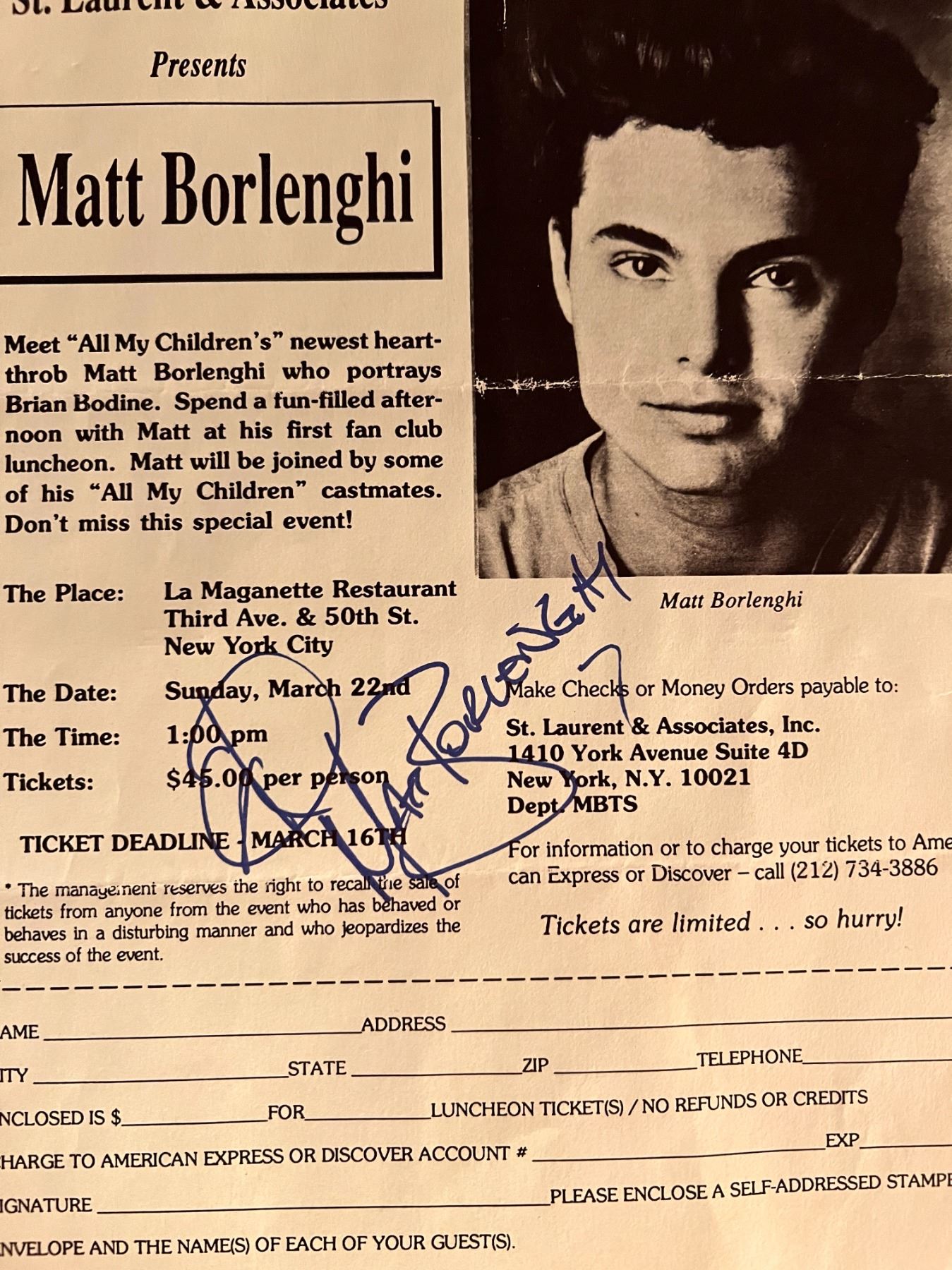 All my Children star Matt Borlenghi autographed invitation