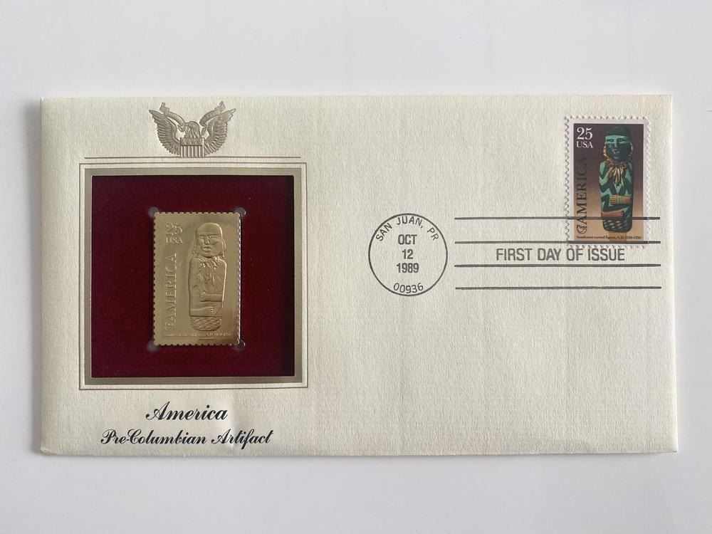 America Pre-Colombian Artifact Gold Stamp Replica First Day Cover. Oct 12th 1989. San Juan, PR. 4x8 inches