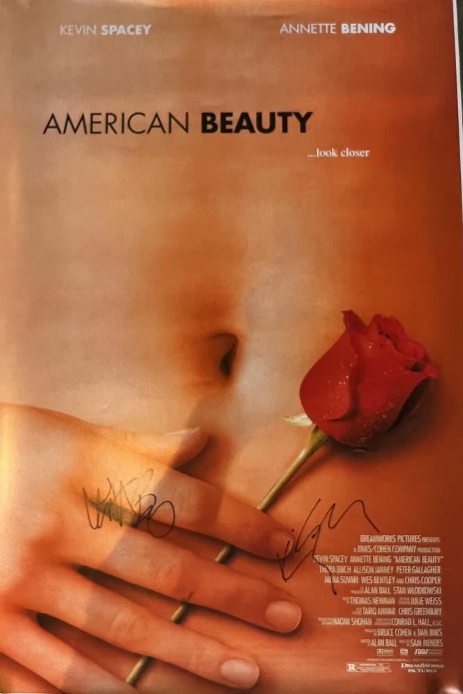American Beauty cast signed movie poster autographed by Kevin Spacey and Annette Bening. 24x37 inches