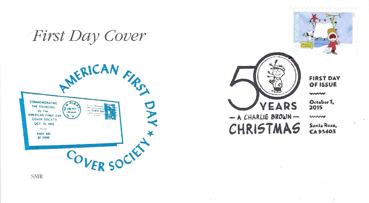 American First Day Cover Society - Celebrating 50 Years "A Charlie Brown Christmas" - First Day of Issue - October 1, 2015 - Santa Rosa, CA 95403 - Peanuts is a syndicated daily and Sunday American comic strip written and illustrated by Charles M. Schulz that ran from October 2, 1950, to February 13, 2000, continuing in reruns afterward. Peanuts is among the most popular and influential in the history of comic strips, with 17,897 strips published in all, making it "arguably the longest story ever told by one human being".