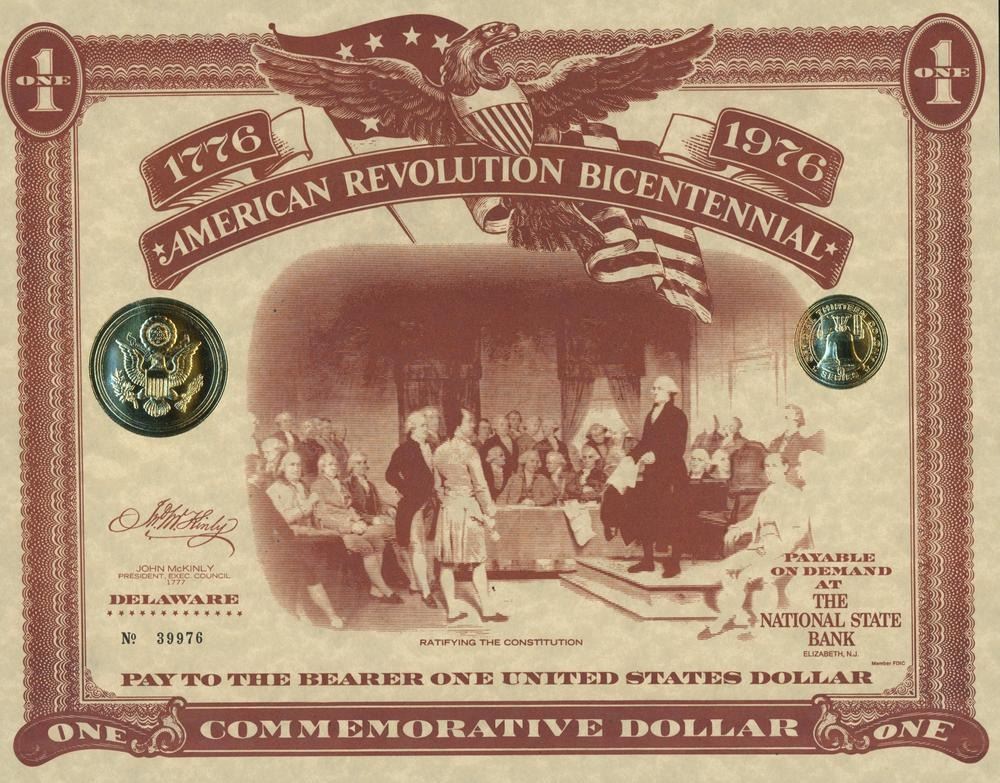 1776-1976 American Revolution Bicentennial Commemorative One Dollar Certificate, Delaware, Ratifying the Constitution