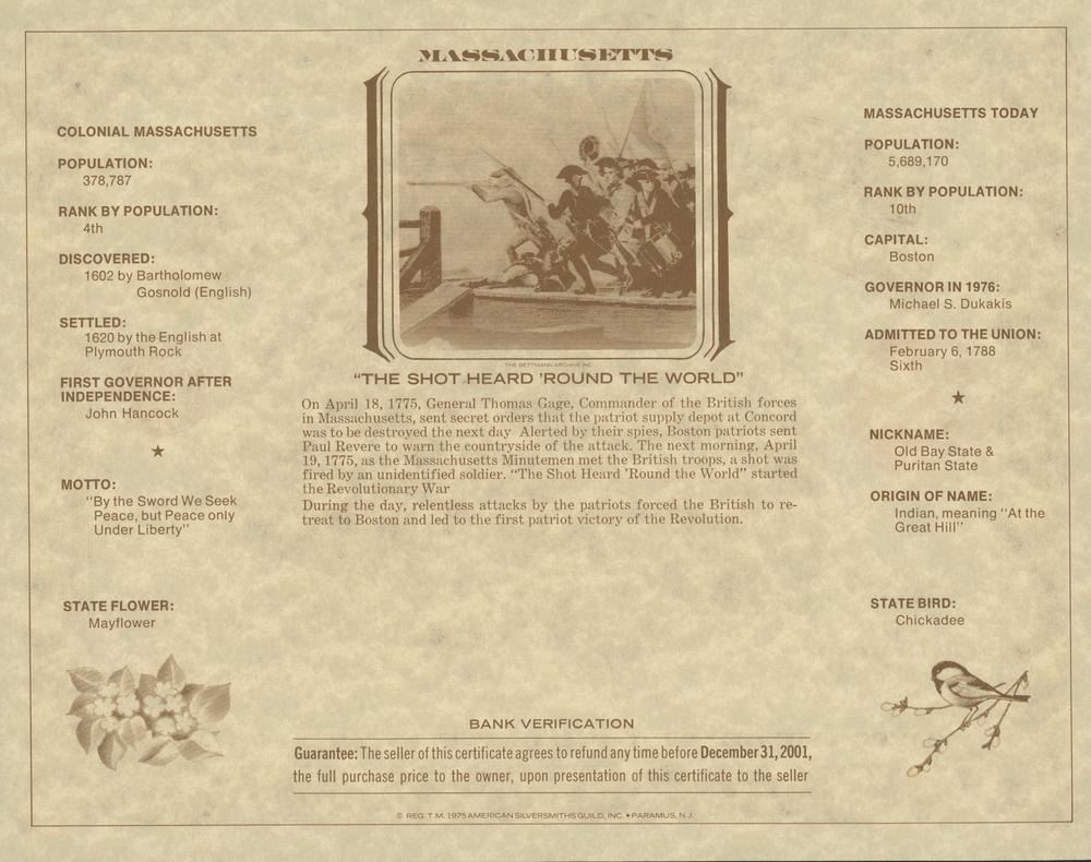1776-1976 American Revolution Bicentennial Commemorative One Dollar Certificate, Massachusetts, "The Shot Heard 'Round the World"