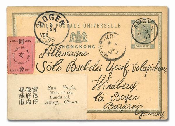 Amoy, 1897 Nov. 29?, Hong Kong postal card sent Amoy to Germany, with Amoy Local, 4c Queen Victoria card, cancelled by single-circle Amoy/A/N[O] 29/97 c.d.s. day unclear, with December Hong Kong transit alongside and Bogen/3/Jan./von/98 German receiver at upper left; senders name and address pasted down at lower left, above which is a black-on-pink Vola Mon/Lafa Zim Amoy Local, Very Fine, rare.