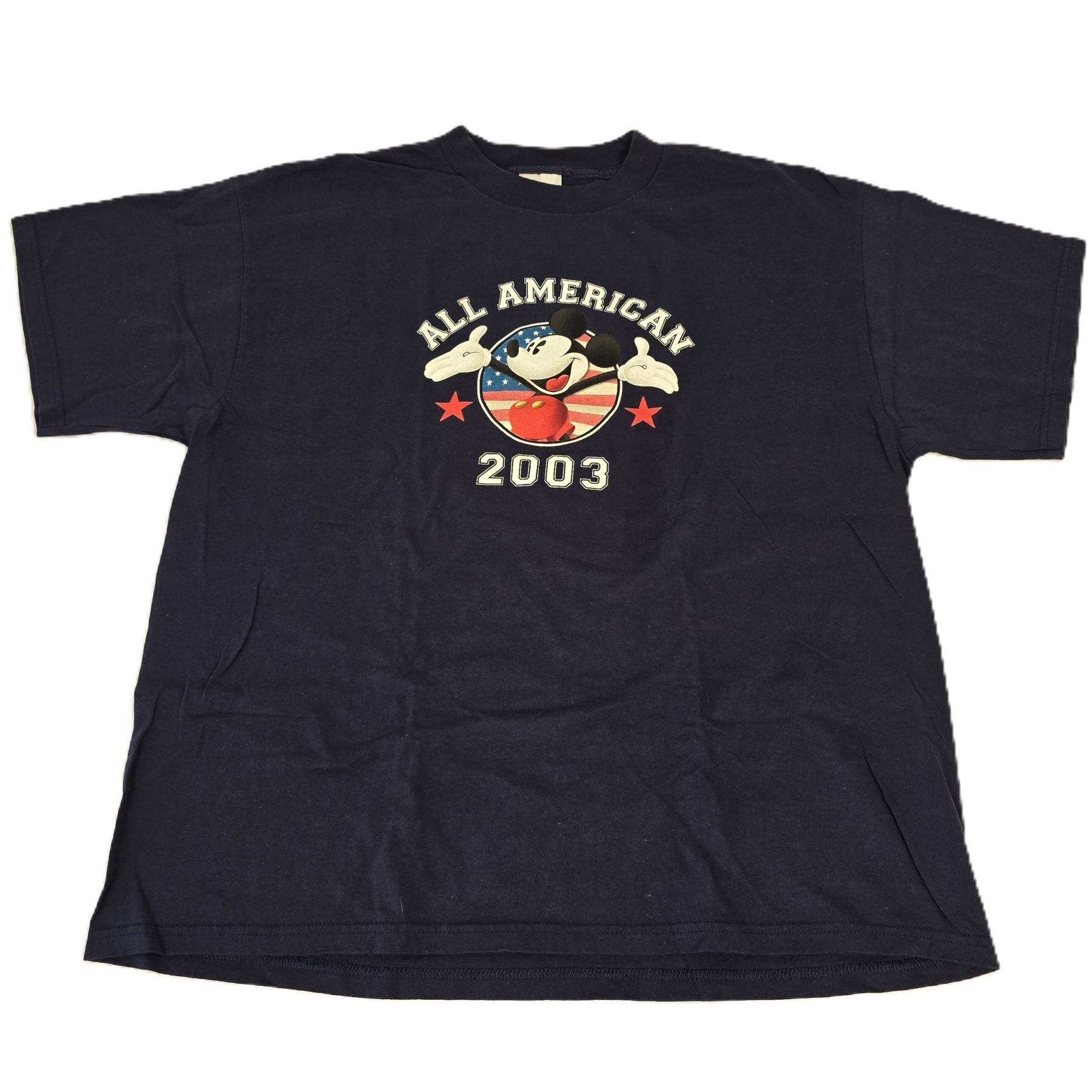 (Disney Store, 2003) This is a dark blue T-shirt featuring Mickey Mouse on a Circle American Flag style background with the words “All American” above and “2003” below. It is in good condition and is size extra large. It weighs 8 oz.