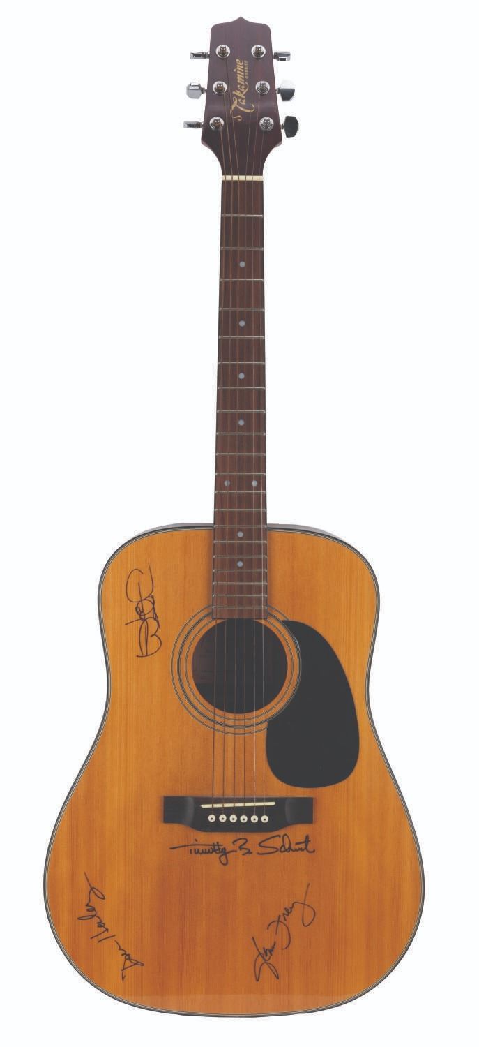 (Takamine, 1990s) A Takamine G530 acoustic guitar signed by four members of the six-time Grammy Award-winning rock band the Eagles. Signatures include those of lead singer Don Henley, guitarist Joe Walsh, bassist Timothy B. Schmit, and guitarist Glenn Frey, all accomplished in black marker. Measuring 15.5” x 5.5” x 41” tall, the signed guitar is in very good condition with light wear.
