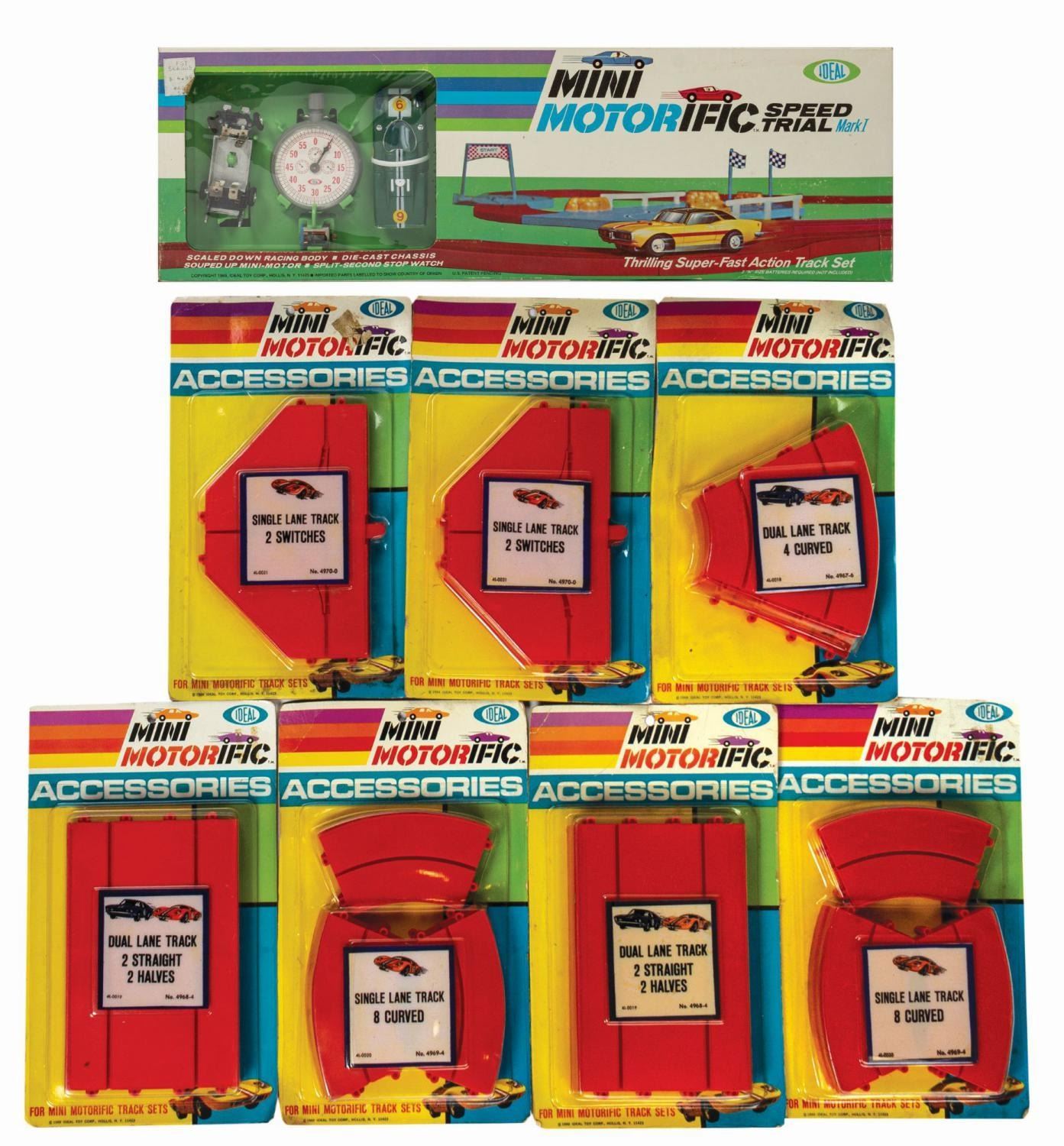 (Ideal, 1969) A Mini Motorific Speed Trial Mark I racing set with seven track accessory packs. This miniature version of Ideal’s larger Motorific toy set includes a die-cast chassis, souped-up mini-motor, split-second stopwatch, and a track set designed for speed. The accessories are unopened and include two sets of 8 Curved Single Lane Tracks, two sets of 2 Straight/2 Halves Dual Lane Tracks, two sets of 2 Single Lane Track Switches, and one set of 4 Curved Dual Lane Tracks. The speed trial set measures 6” x 19.25” and 3” tall and the accessories are on their original cardboard backings measuring 11” x 7”. All are in very good condition with some edge wear, including some bending and creasing to the cardboard backings, and general surface wear from age. The racing set box is in very good condition, open at one end with creased flaps, and some expected shelf wear and scuffs. The toy is unused and in fine condition with interior shrink wrap unbroken.