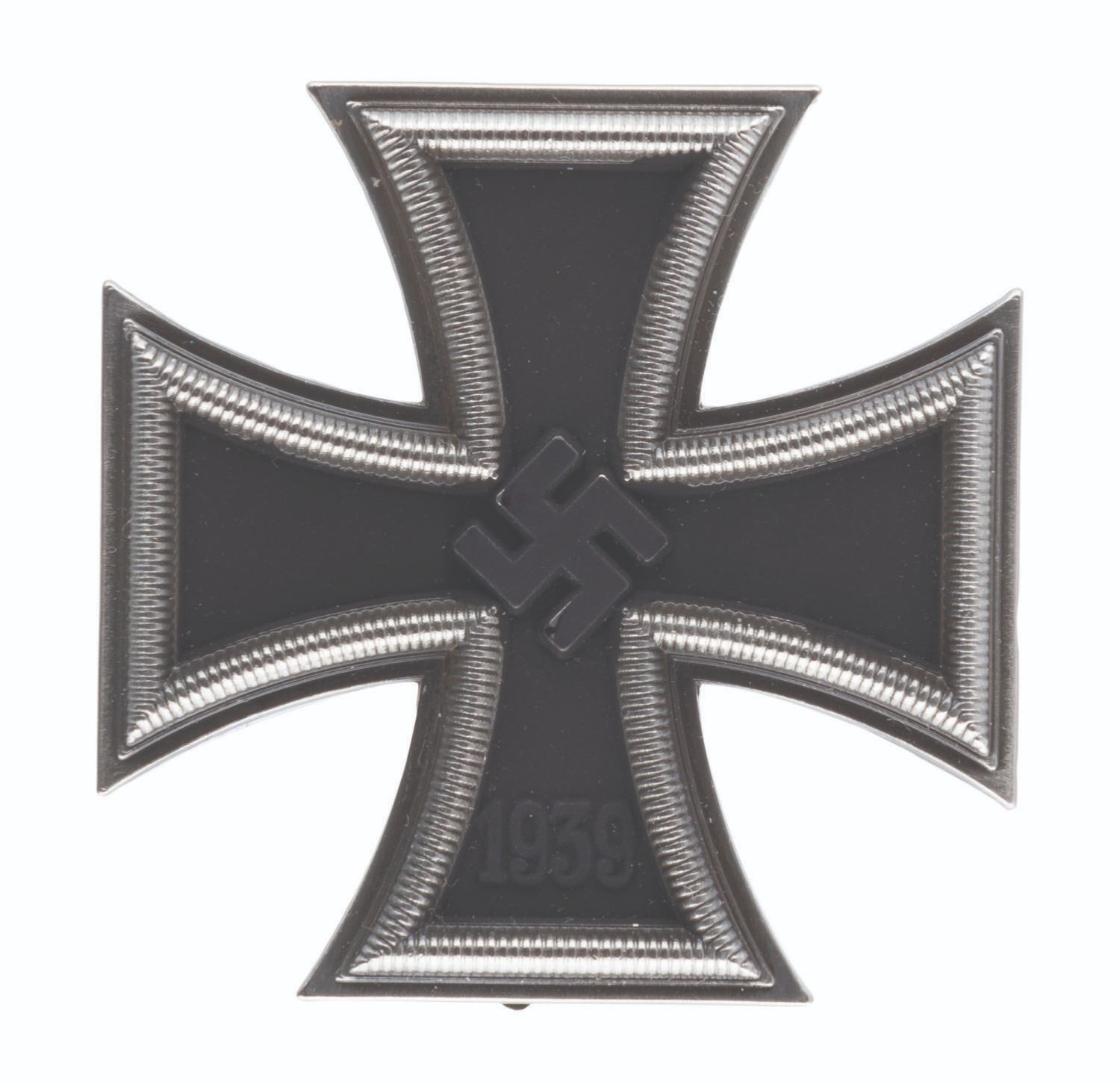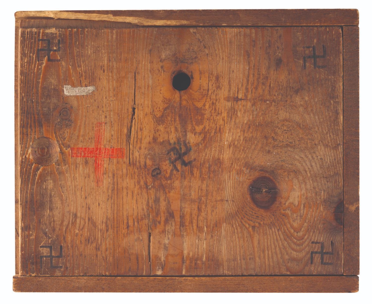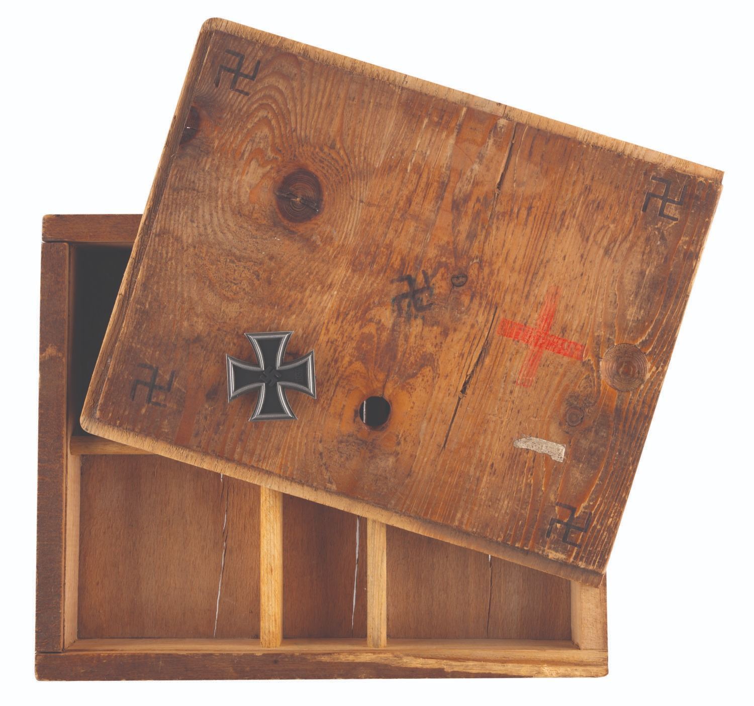 (Paramount, 1981) A prop box with swastikas and an Iron Cross medal pin, from the production of either "Raiders of the Lost Ark” or "Indiana Jones and the Last Crusade.” Pieces from both films were acquired when the collection of the Berman and Nathans costume company was liquidated in 1992. The 1.75” x 1.75” pewter badge is in very good condition with light handling wear. The 9” x 11.5” x 1.75” wooden box displays in good condition, intentionally built crudely with gaps in the bottom panel, and difficult to slide open and closed.