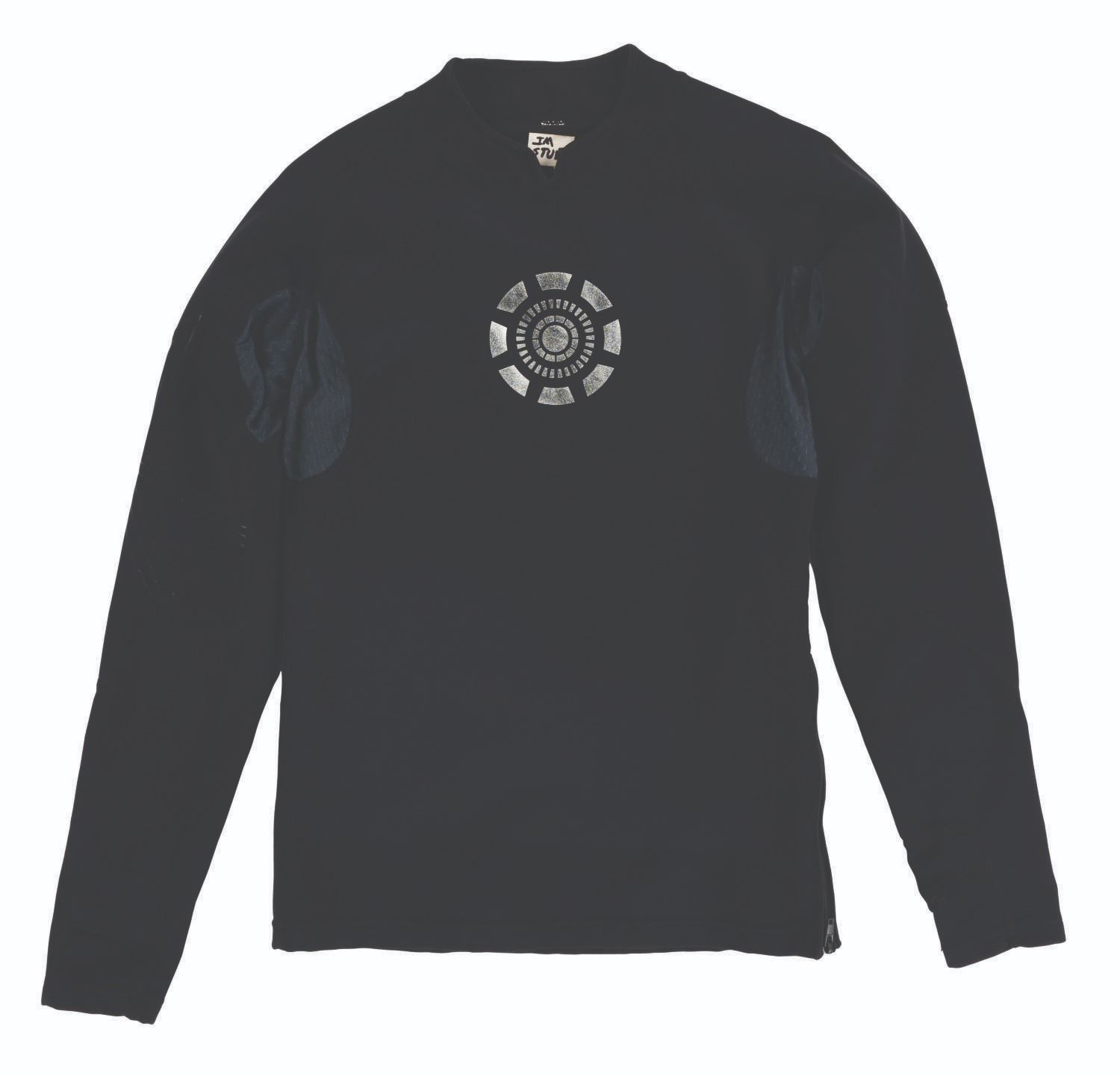 (Disney, 2013) An "Iron Man 3” costume shirt worn by a stunt double for Robert Downey Jr., with Tony Stark’s arc reactor insignia at the center of the chest. The unlabeled neoprene shirt appears to be a size medium, in very good condition with light wear from production use.