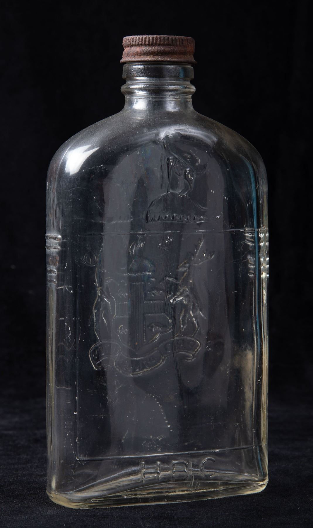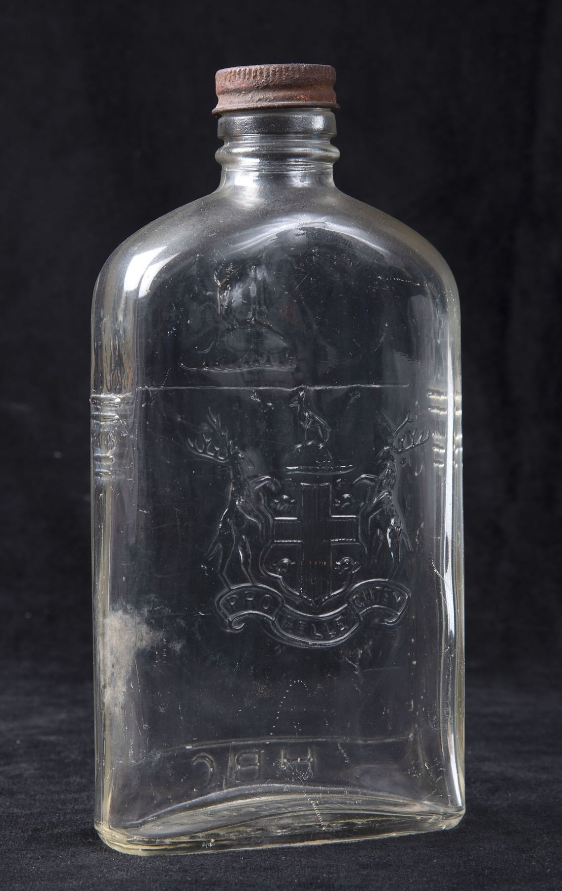 An attractive 18.5cm tall, 9.2cm wide glass spirits bottle of the Hudson's Bay Company, with large embossed Company crest at center-front, and tall embossed torches on both outer edges. With original rusted cap (brown interior cork reains fairly pristine). Embossed text on bottom indicates 12 oz volume, and seeming registeration date of 1933. A very nice HBC piece, and certainy not a common artifact