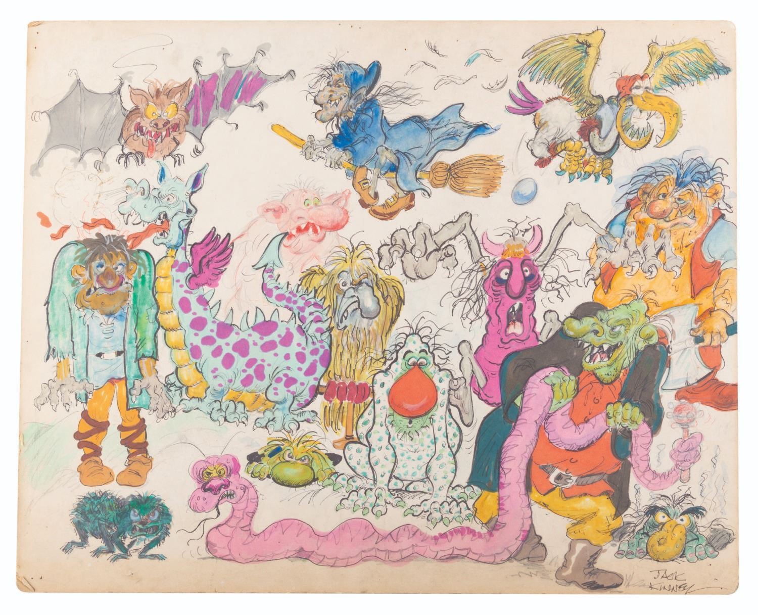 (Kinney, 1950s-80s) A hand-drawn page of monsters and ghoulish creatures, signed by Disney artist, Jack Kinney. Kinney is best known for his work as a sequence director on Disney films such as "Pinocchio,” "The Three Caballeros,” "The Adventures of Ichabod and Mr. Toad,” and many others. Accomplished in graphite, ink, and paint on illustration board, the drawing measures 16” x 20” and is in good condition with edge wear, dulled corners with pinholes, and light discoloration from age.