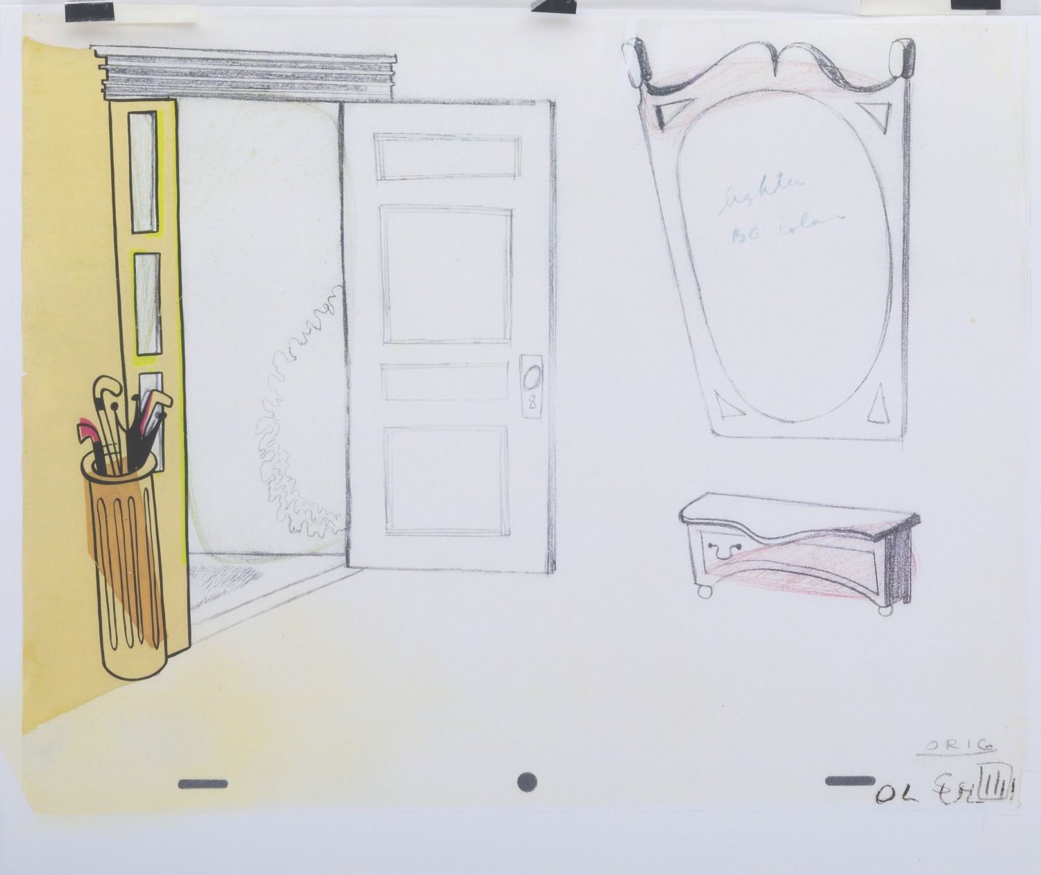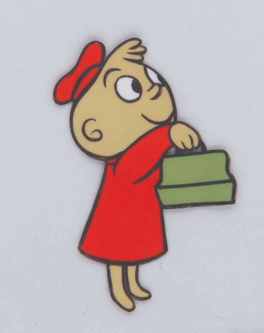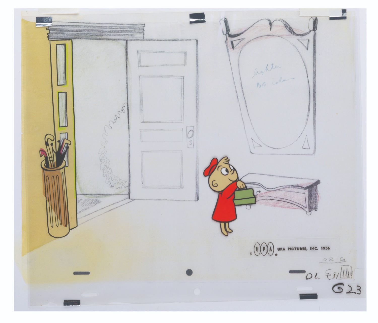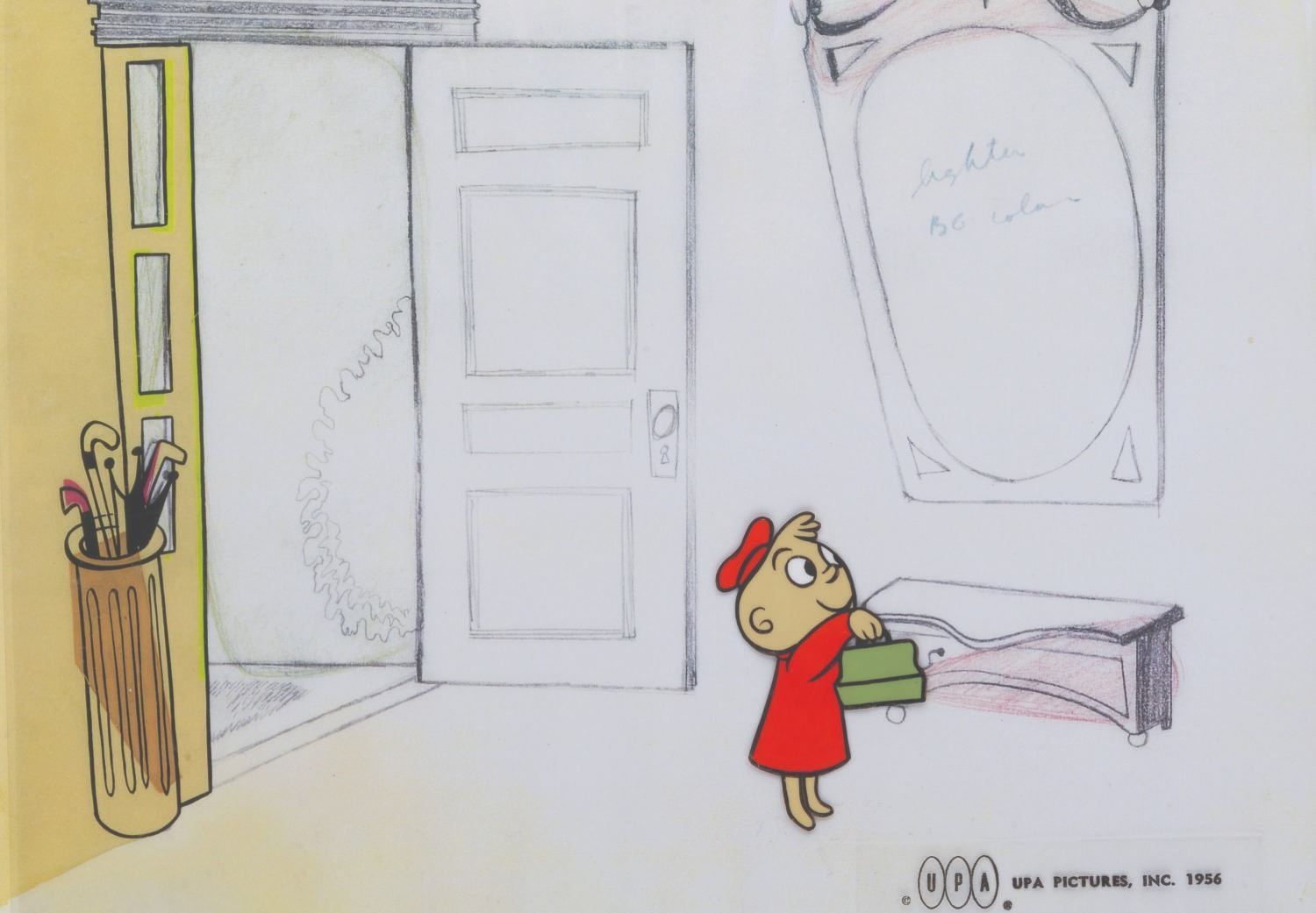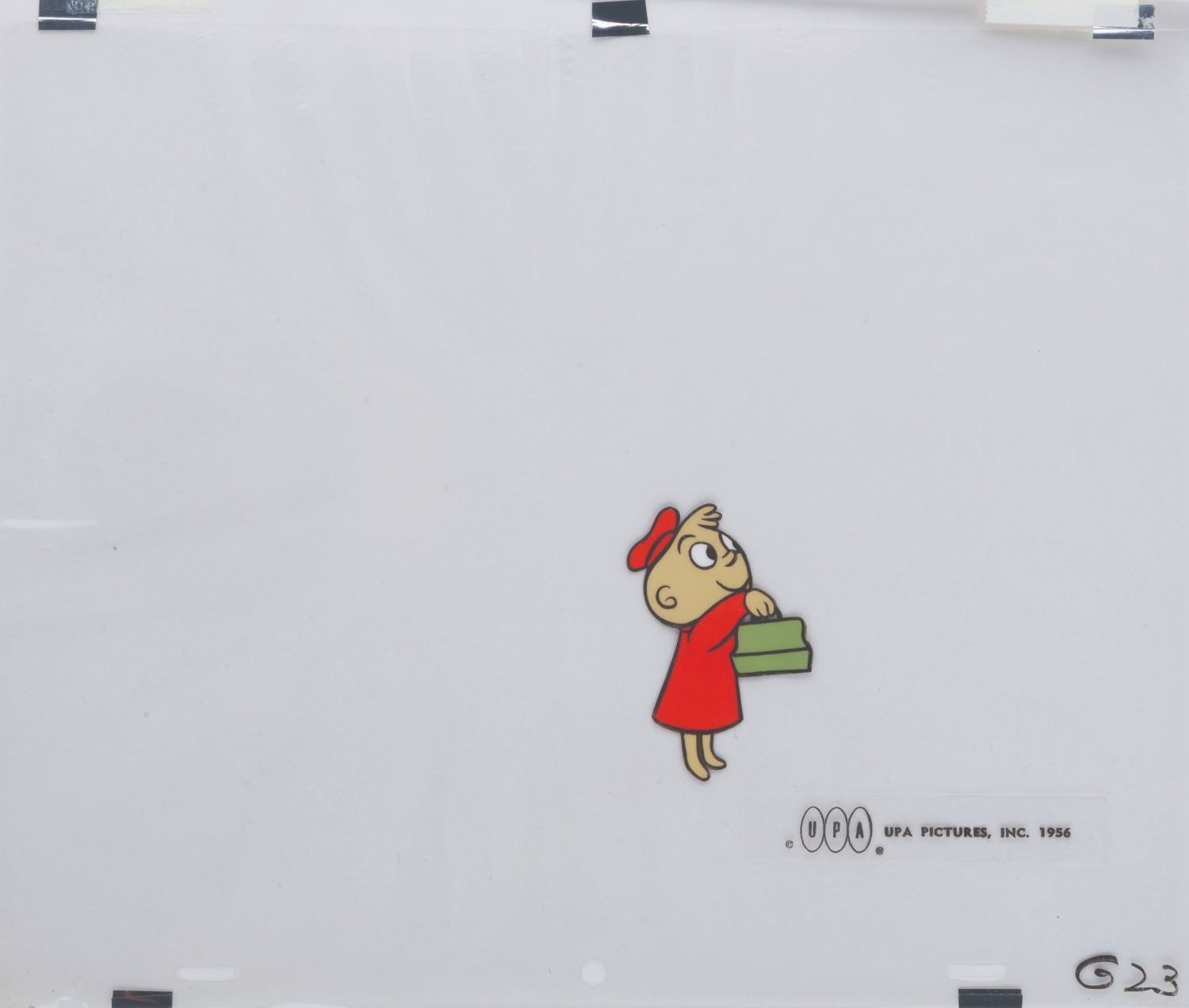 (UPA, 1950) An original production cel from the ground-breaking UPA Studios animated short, "Gerald McBoing-Boing.” Measuring 10.25" x 12.5" overall, and with an image measuring 3" x 2", the production cel is in very good condition with handling wear and is paired with a color copy reproduction background.