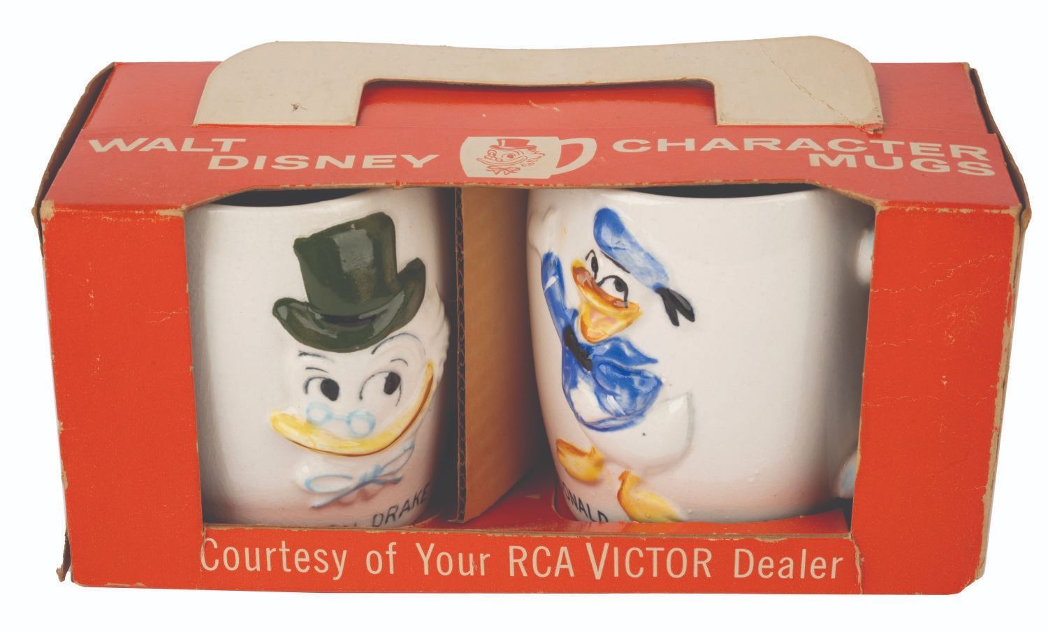 (RCA, 1961) An RCA-Victor Walt Disney Character Boxed Mug Set. This boxed pair of mugs was given away as a promotion for Walt Disney's "Wonderful World of Color." The mugs feature 3D reliefs of Donald Duck and Ludwig Von Drake and come packaged within the rarely retained RCA-Victor dealer box. Measuring 3.5" tall and 4.5" at its widest diameter, each mug displays in good condition with crazing throughout. The 7" x 3.5" x 3" box is in fair condition with edge and corner wear, tears, a crease to the handle, and light discoloration from age.
