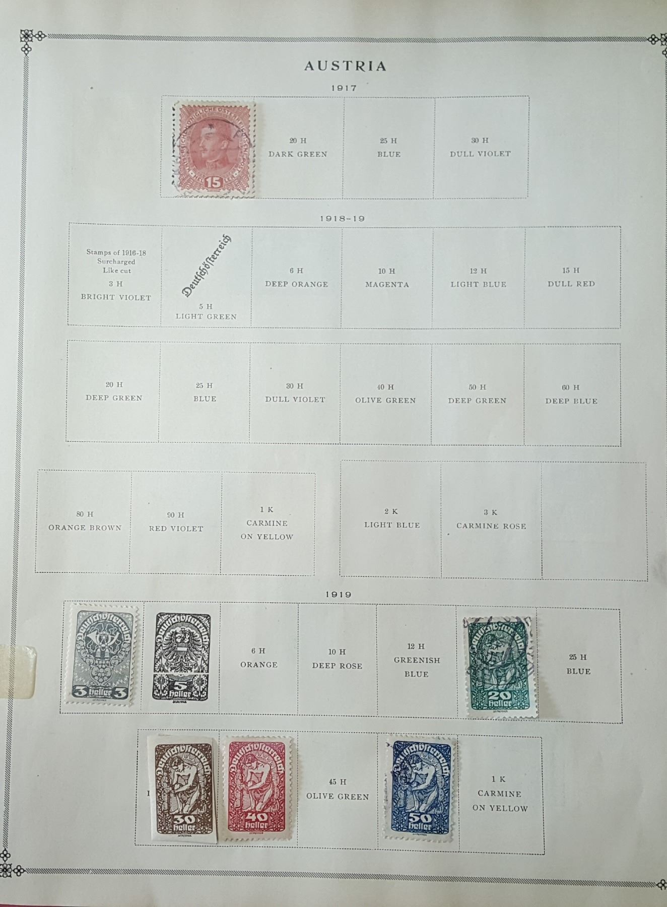In 1919 the republic issued new designs; a post horn, the coat of arms, a kneeling man representing the new republic, and the Parliament building, all done in a vaguely Art Nouveau style, and inscribed "DEUTSCHÖSTERREICH" ("ÖSTERREICH" appeared in 1922).