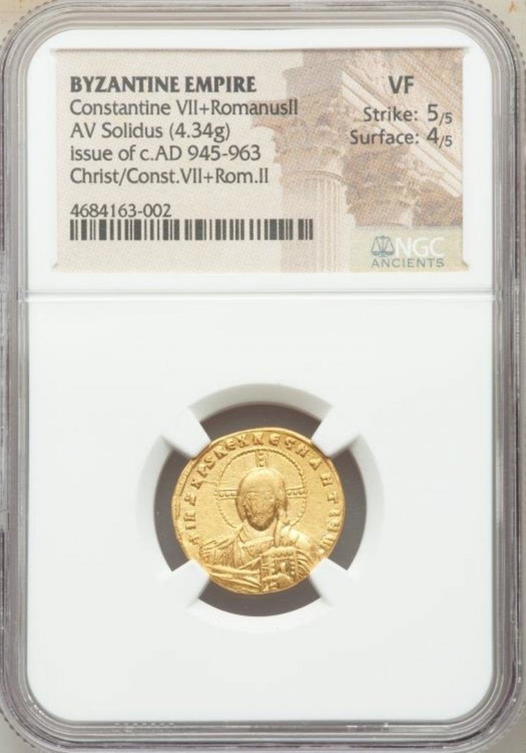 Ancient Byzantine VII Porphyrogenitus and Romanus II (AD 945-963). gold solidus (19mm, 4.34 gm, 6h). NGC VF 5/5 - 4/5. Constantinople, AD 950-955. + IhS XPS RÐX RÐNANTIЧM, facing half-length bust of Christ, wearing nimbus cruciger with three pellets in each limb, pallium and colobium, raising right hand in benediction, book of Gospels in left / COhSTAhT CÐ ROmAh' AЧΣ I'R', crowned facing busts of Constantine VII (on left), wearing loros, and Romanus II (on right), wearing chlamys pinned at right shoulder, jointly holding patriarchal cross between them. Sear 1751.
