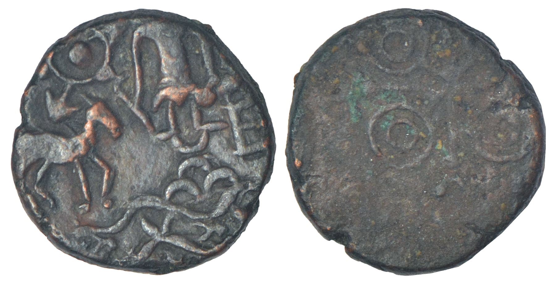 Ancient Central Malwa, Vidisha region - city-state coinage, die-struck copper coin of Kurara (c.200-150 BC), PAIC 837, 11.05g. Obv: Brahmi legend Kuraraya above a stylized bird. Rev: traces of tree-in-railing and open cross symbols.