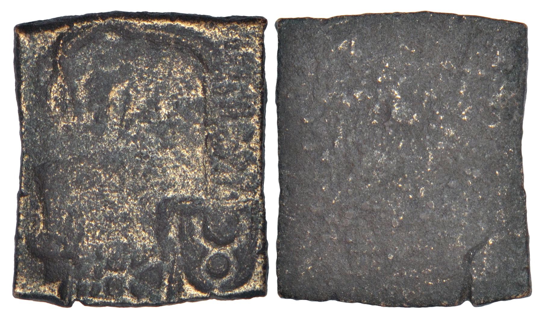 Ancient Central Malwa, Vidisha region - uniface inscribed copper punch-marked coin of Bhumidatta (c.200-150 BC), PAIC 913, 3.75g. Obv: six punches - 1. elephant to left, 2. triangle-headed standard in railing, 3. river with fishes 4. tree-in railing, 5. Taurine in semicircle, 6. Brahmi legend Raño Bhumidatasa.