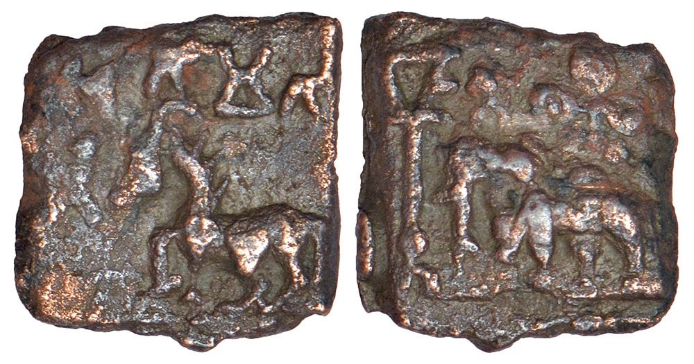 Ancient Chedi region - uninscribed cast coinage of Suktimati city-state, (c.200-150 BC), 1.85g. Obv: horse walking to left, sacrificial pillar to left; Brahmi legend Sutimati above. Rev: elephant standing facing left in front of a triangle-headed standard, 'Ujjain' symbol above and a pedestal below.