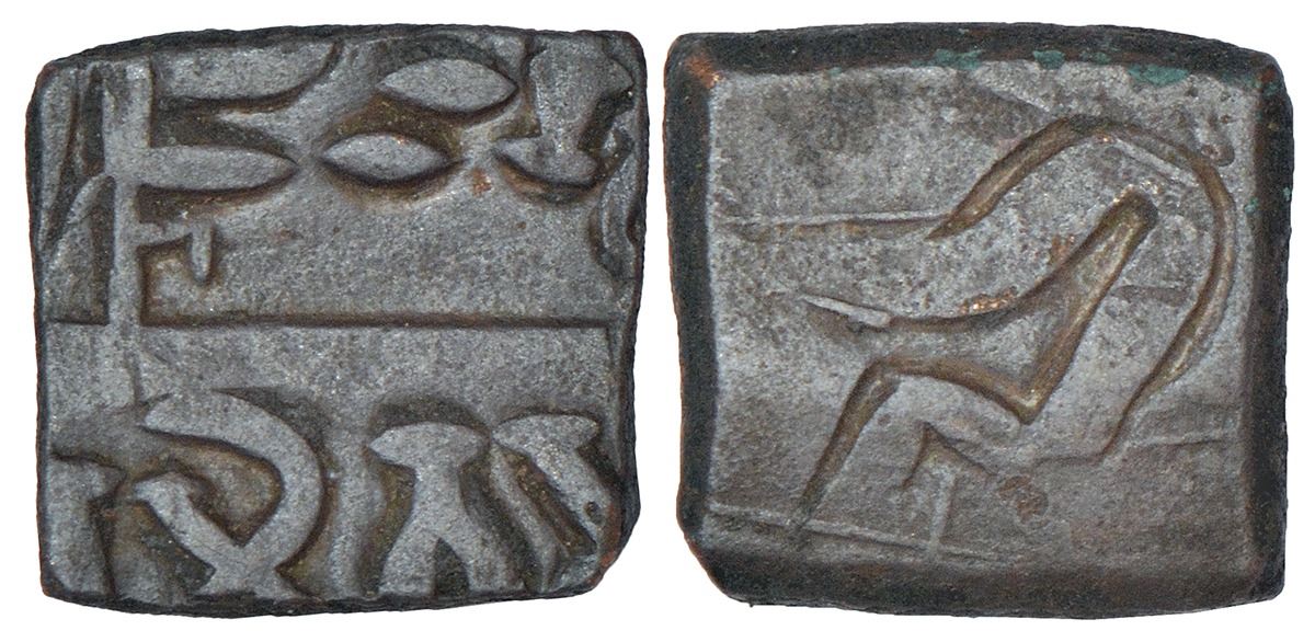 Ancient Eastern Malwa, Dasharna area - monarchical coinage around Erikachha city state, Betwa valley (c.100-50 BC), copper coin of Ishwaramitra, PAIC 958, 3.09g. Obv: Brahmi legend in two punches - Rajno Ishwa / ramitrasa. Rev: sacrificial post or Yupa in railing.