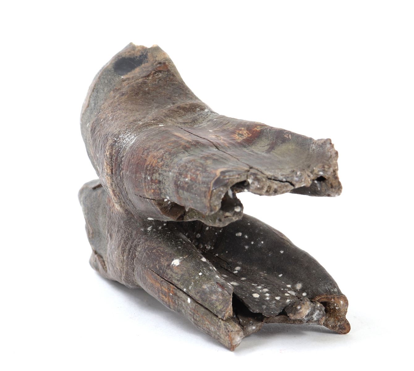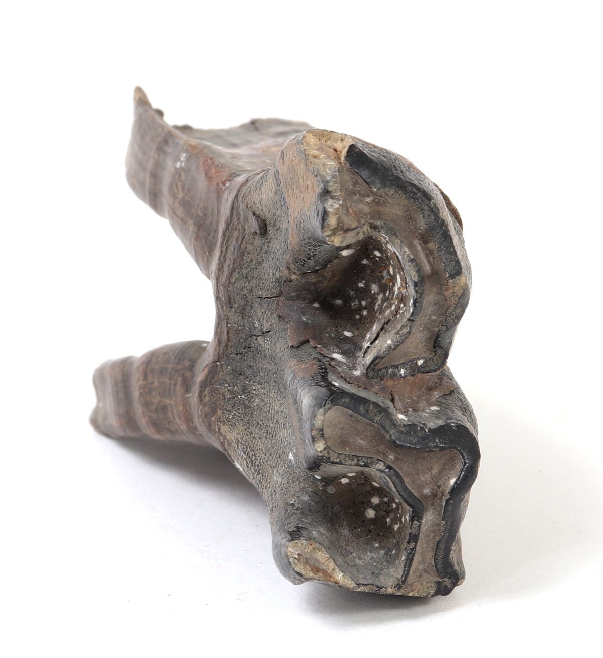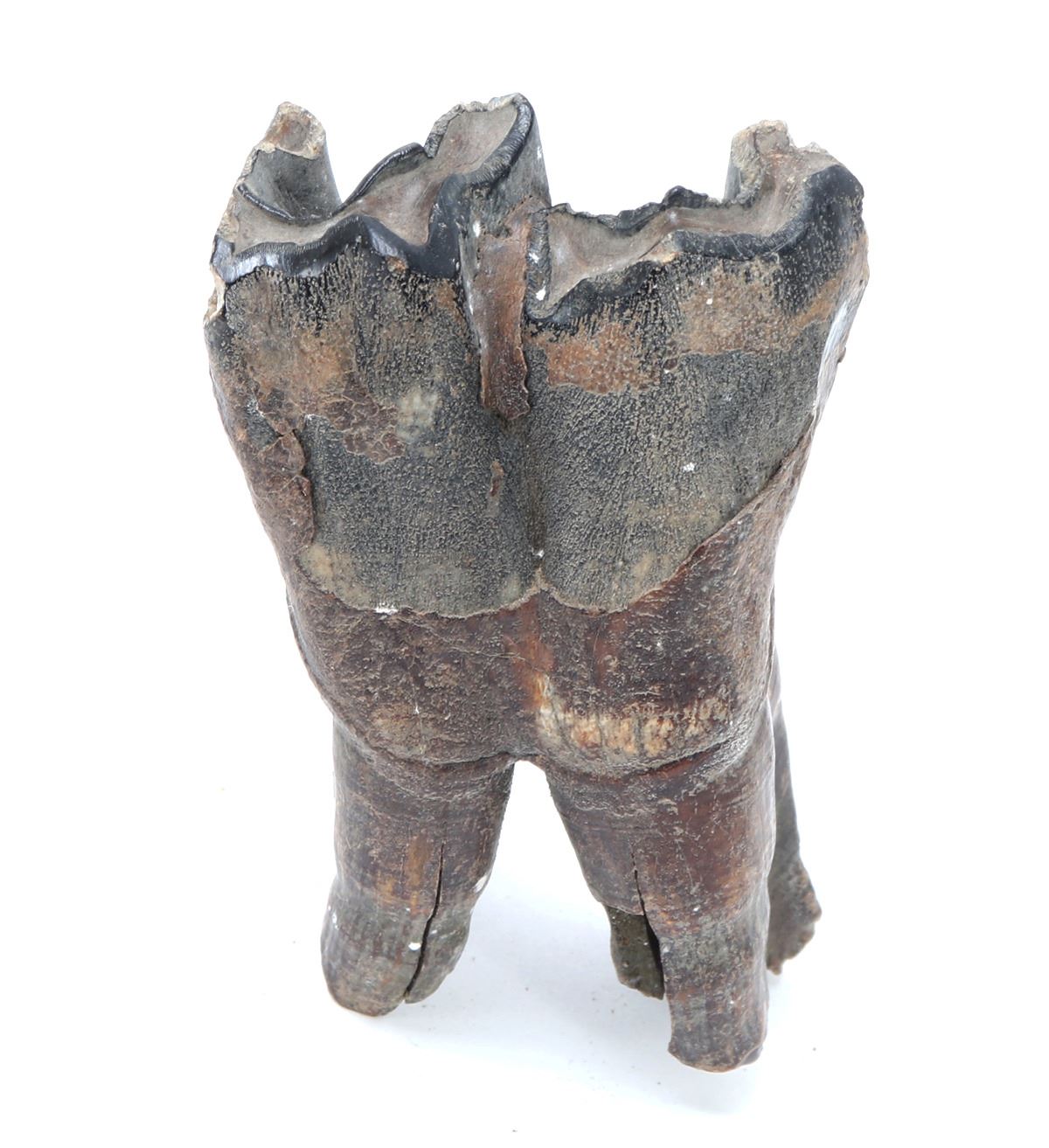 Wonderful ancient fossilized wooly mammoth tooth, once part of the powerful jaw of one of Earth’s most iconic prehistoric giants. Each enamel ridge is sharply defined, and the tooth has excellent preservation with natural coloration ranging from ivory beige to earthy brown and gray. Size 3 3/4" H, Weight 134 g. Condition: Well preserved condition with ancient losses as shown.