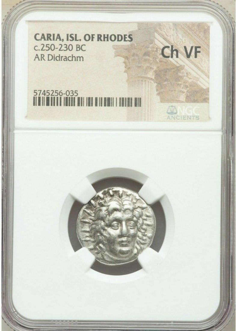 Ancient Greek CARIAN ISLANDS. Rhodes. Ca. 250-200 BC. AR (silver) didrachm (21mm, 12h). NGC Choice VF. Timotheus, magistrate. Radiate head of Helios facing, turned slightly right, hair parted in center and swept to either side / ΤÎÎÎ, rose with single bud on tendril to right; herm left to left, P-O flanking stem. HGC 6, 1439. Ashton 209.