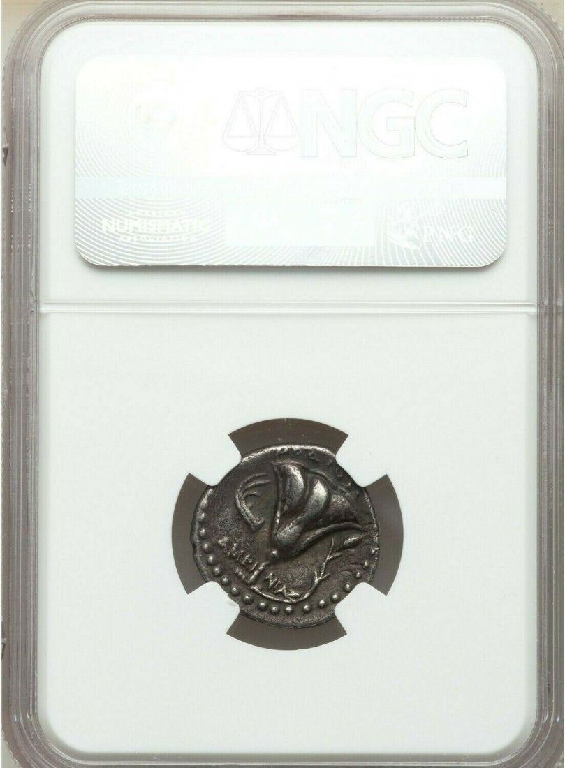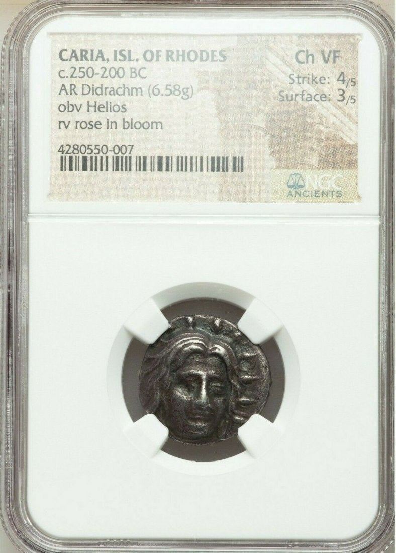Ancient Greek CARIAN ISLANDS. Rhodes. Ca. 250-205 BC. Silver didrachm (19mm, 6.58 gm, 2h). NGC Choice VF 4/5 - 3/5. Ca. 225-205 BC, Ameinias, magistrate. Radiate facing head of Helios, turned slightly right, hair parted in middle and swept to either side / ΡÎÎ, rose with single bud on tendril to right; AMEINI-AΣ flanking stem, galley stern left in left field. HGC 6, 1440. Ashton 218.