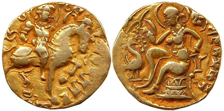 Kumar Gupta I, Gold Dinar, 8.12g, “Horse Rider”, Obv: King riding a horse to right, Rev: Goddess Nimbate seated on a wicker-stool, she is feeding peacock in front of her, holding a long-stemmed lotus behind. Brahmi legend “Ajit Mahendrah” in right field (S Kumar# Class3, Varity C). Very fine, very rare.