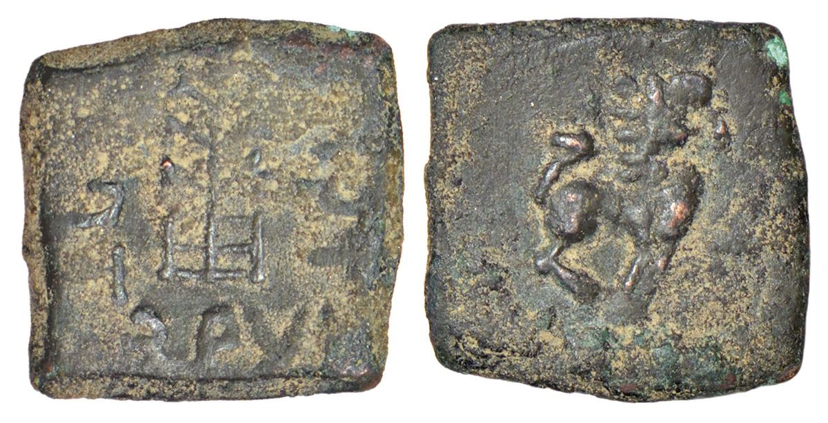 Ancient India: Ancient Agroha (Punjab-Haryana) region - copper coin of 'Agacha Janapada', (c.150-100 BC), variant of type # Pl. II-7-8, 'Tribal coins of Ancient India' by Devendra Handa, 2.71g. Obv: tree-in-railing in centre, Brahmi legend around …godake Agacha Janapa…. Rev: lion seated facing right in profile, with curled tail.