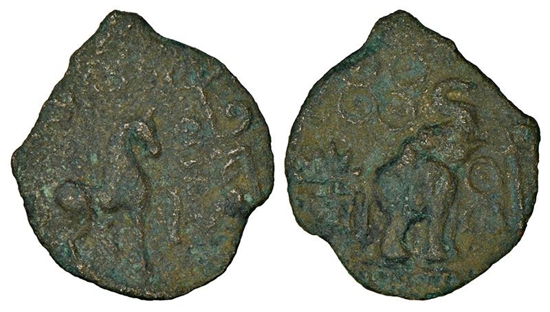 Ancient Baghelkhand (Chedi Desha), cast copper coin of the city State of Suktimati (150-100 BC), Pieper 1008, 3.30g. Obv: Horse walking to right, rectangle with four droplets inside to right with Srivatsa above; traces of Brahmi legend Sutimati above the horse. Rev: Elephant standing facing right on pedestal with upraised trunk, 'Ujjain' symbol above, tree railing to left, upside down Nandipada and a triangle-headed standard to right.