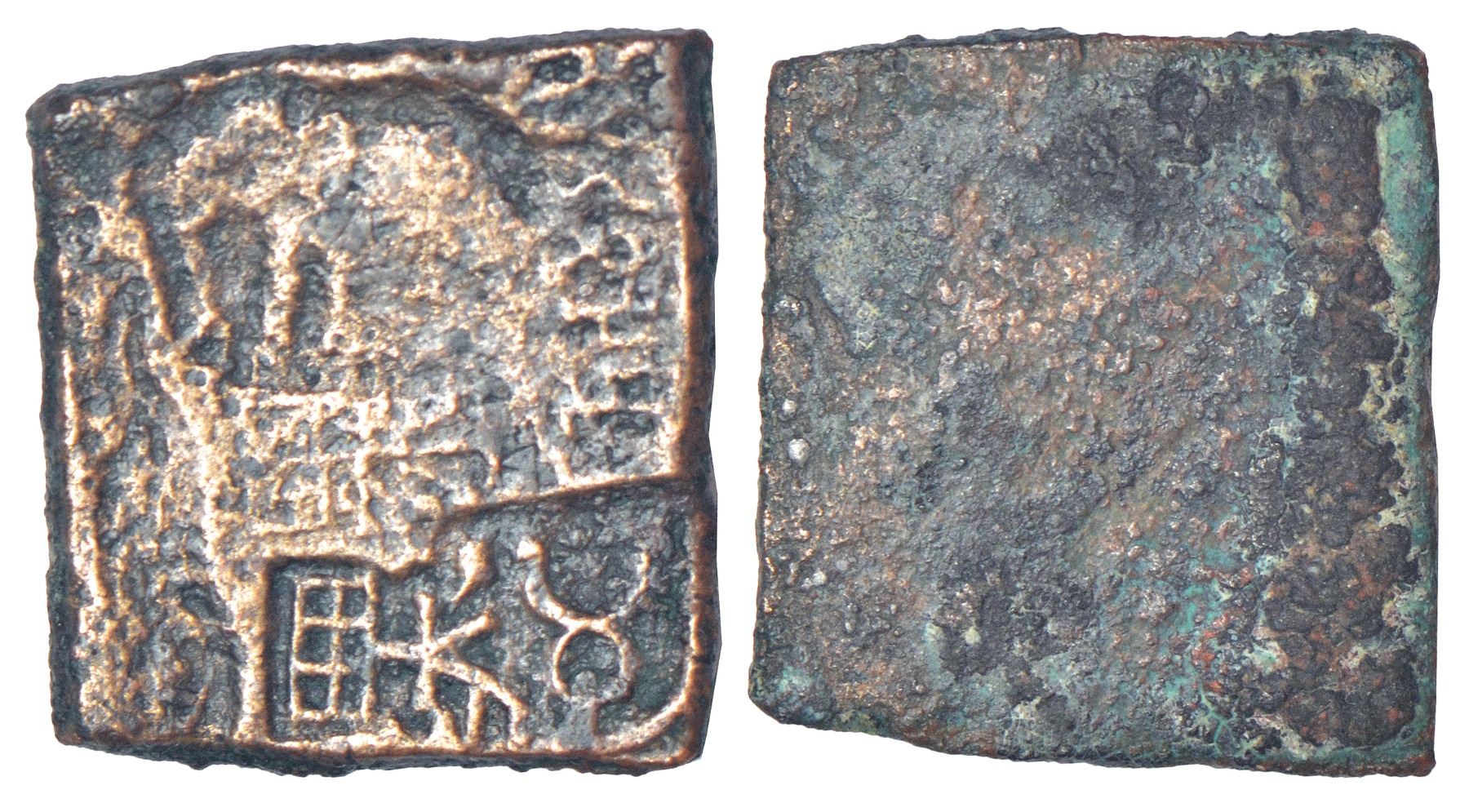 Ancient Central Malwa, Vidisha region - uniface inscribed copper punch-marked coin of Bhumidatta (c.200-150 BC), PAIC 913, 4.87g. Obv: Six punches - 1. Elephant to left, 2. Triangle-headed standard in railing, 3. River with fishes 4. Tree-in railing, 5. Taurine in semicircle, 6. Brahmi legend Raño Bhumidatasa. Rev: Blank.