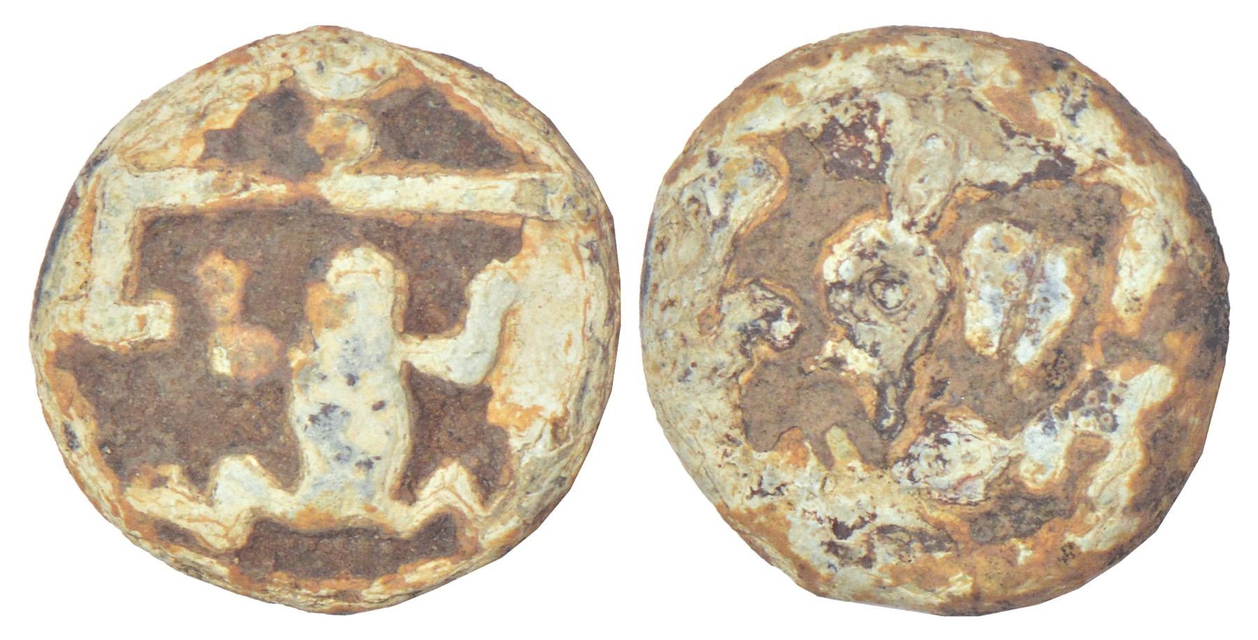 Ancient Eastern Malwa, Dasharna area, lower Betwa valley - civic coinage, die-struck lead coin of 'Mrigamukha' city -state (c.200-150 BC), PAIC 964, 6.22g. Obv: Frog under a balance stick. Rev: Brahmi legend Mugamukhe.