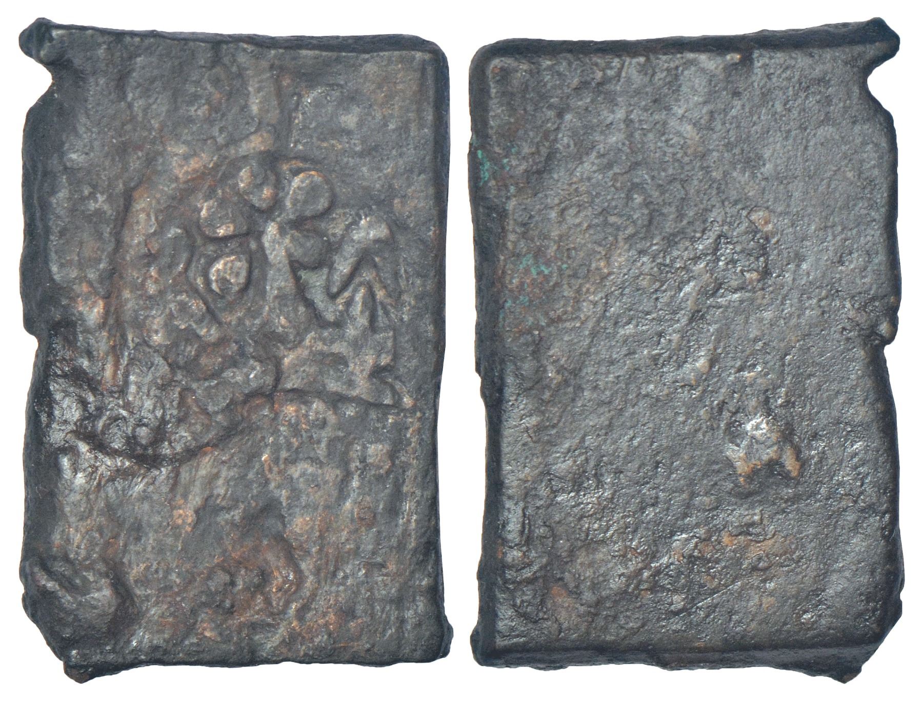 Ancient Eastern Malwa, Dasharna area, Betwa valley - copper coin of Erikachha city-state (c.200-150 BC), similar to PAIC 941, 9.64g. Obv: Brahmi legend Erika…; a stylized palm-tree and a strung bow-and arrow to its right. Rev: Blank.