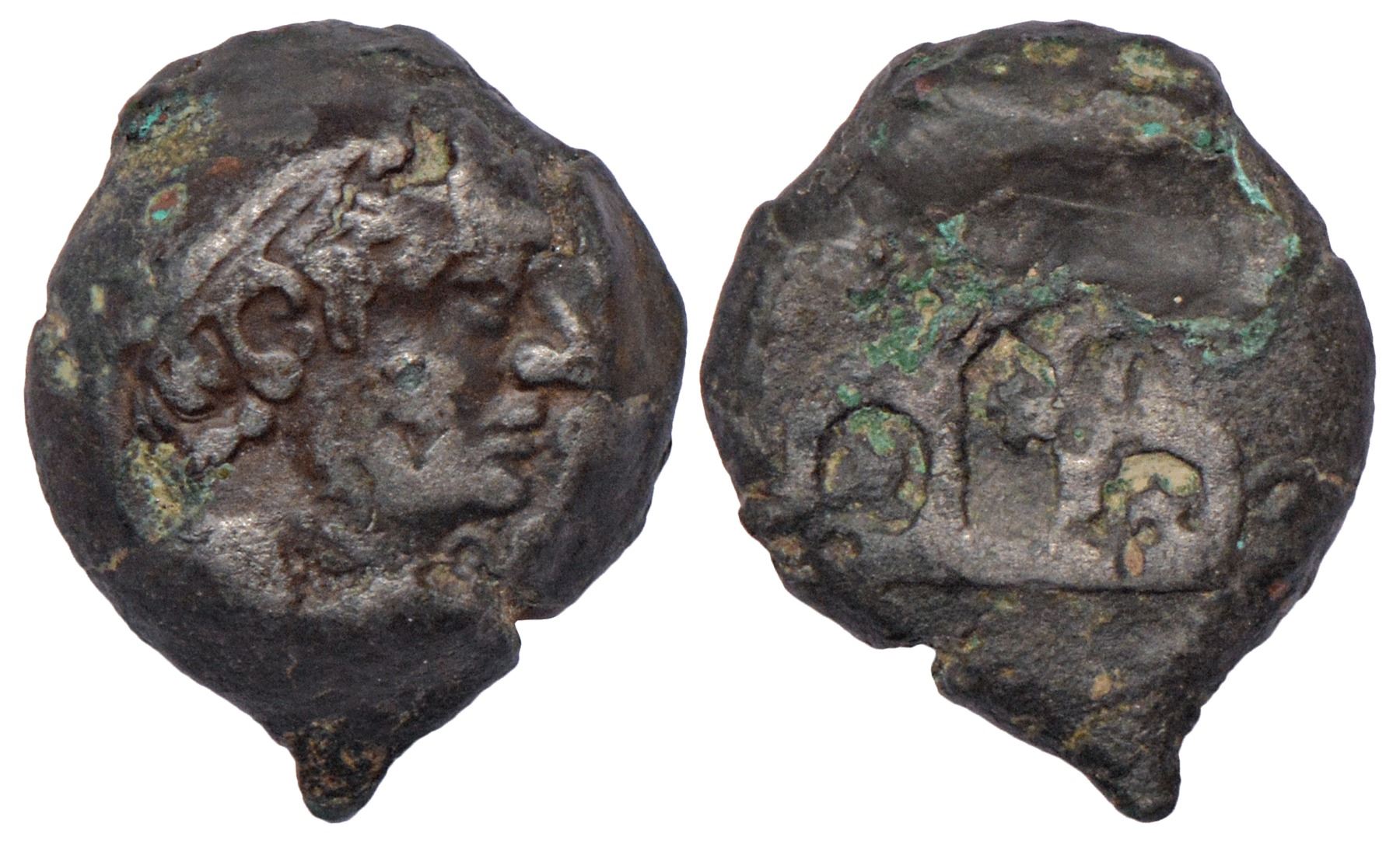 Ancient Malwa, Central region, post-Mauryan inscribed die-struck coinage, alloyed copper coin of Vijayamitra, a local ruler, (250-200 BC), 9.66g. Obv: Diademed Greek-style bust facing right; traces of Brahmi legend Vijayamita ro the right. Rev: Three-arched hill with crescent and Swastikas in each arch.
