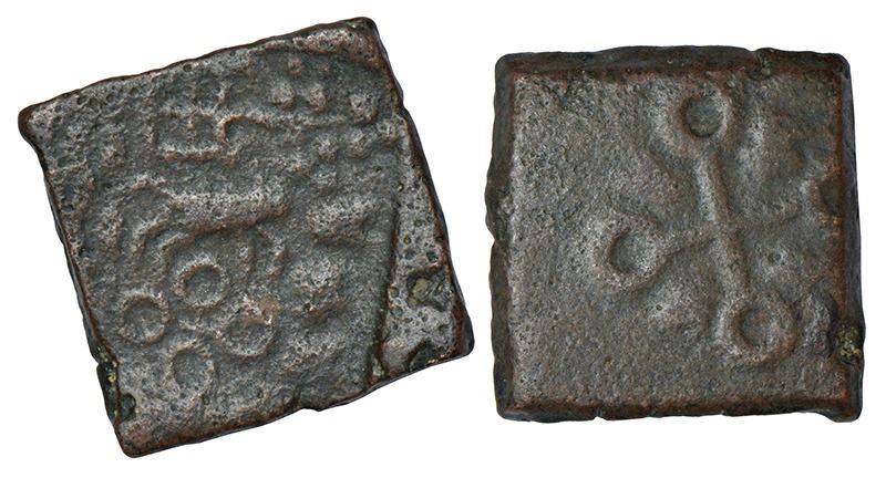 Ancient Malwa, Maheshwar region, post-Mauryan uninscribed die-struck copper coin, (200-150 BC), similar to Pieper '348, 3.46g. Obv: Symbolic configuration, horse/ass facing right in centre, 'Ujjain' symbol below, horizontal tree-in-railing 'above and small taurines and Swastikas to right. Rev: 'Ujjain' symbol with small Nandipadas in quadrants.