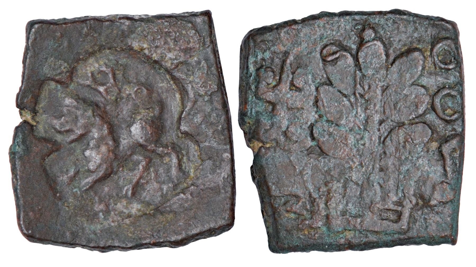 Ancient Malwa, Ujjain/Mandasor region, post-Mauryan uninscribed die-struck copper coin, (200-150 BC), not listed in Pieper, 2.87g. Obv: Maned lion rampant, facing left, small Nandipada above (counterstruck on the reverse of another type). 'Rev: Traces of undertype, tree-in-railing in centre, wavy line below, Shrivatsa to left, Swastika below it, small 'Ujjain’ symbol to right and a wheel below it.