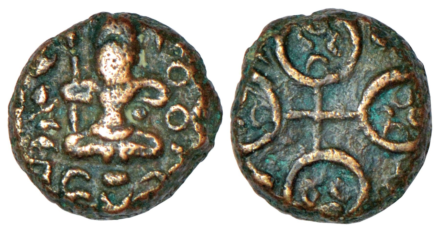 Ancient Malwa, Ujjain region, post-Mauryan inscribed die-struck copper coin of the 'Ujjain' series, Bhumimitra (200-150 BC), Pieper 405 - 406, 3.23g. Obv: Human figure seated cross-legged on lotus, wearing hair-bun and carrying a staff and water-pot, traces of tree-in-railing to left; Brahmi legend Bhumi(mita)… partly visible to right.