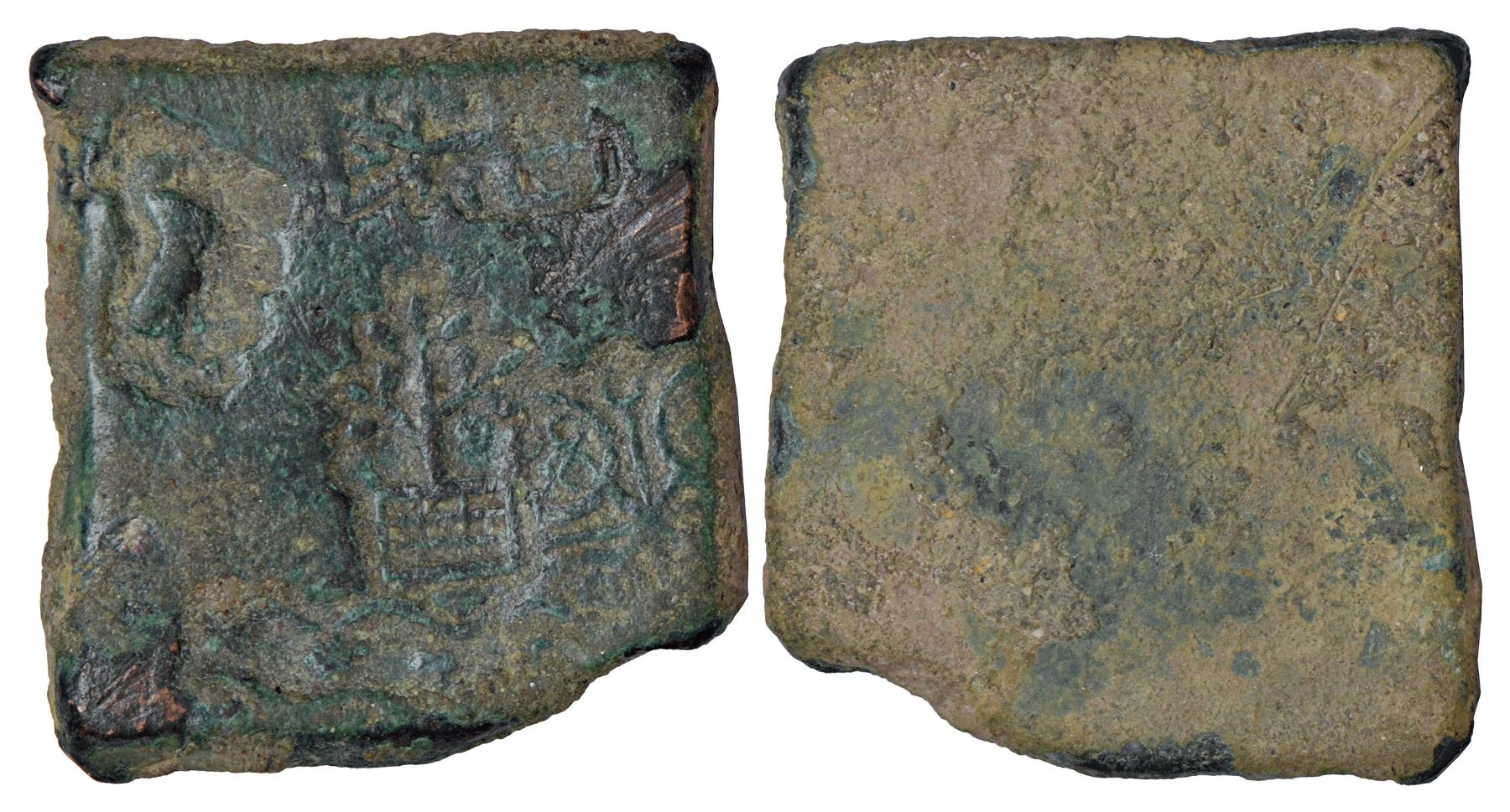 Ancient Malwa, Vidisha region, post-Mauryan uninscribed punch-marked copper coin, (200-150 BC), Pieper 467, 13.19g. Obv: Five punches, railed tree in centre, horse to left, 'Ujjain' symbol with small 'Ujjain' symbols in each orb and a cross superimposed on it to right, tringle-headed standard in railing above and river with fishes below. Rev: Blank.